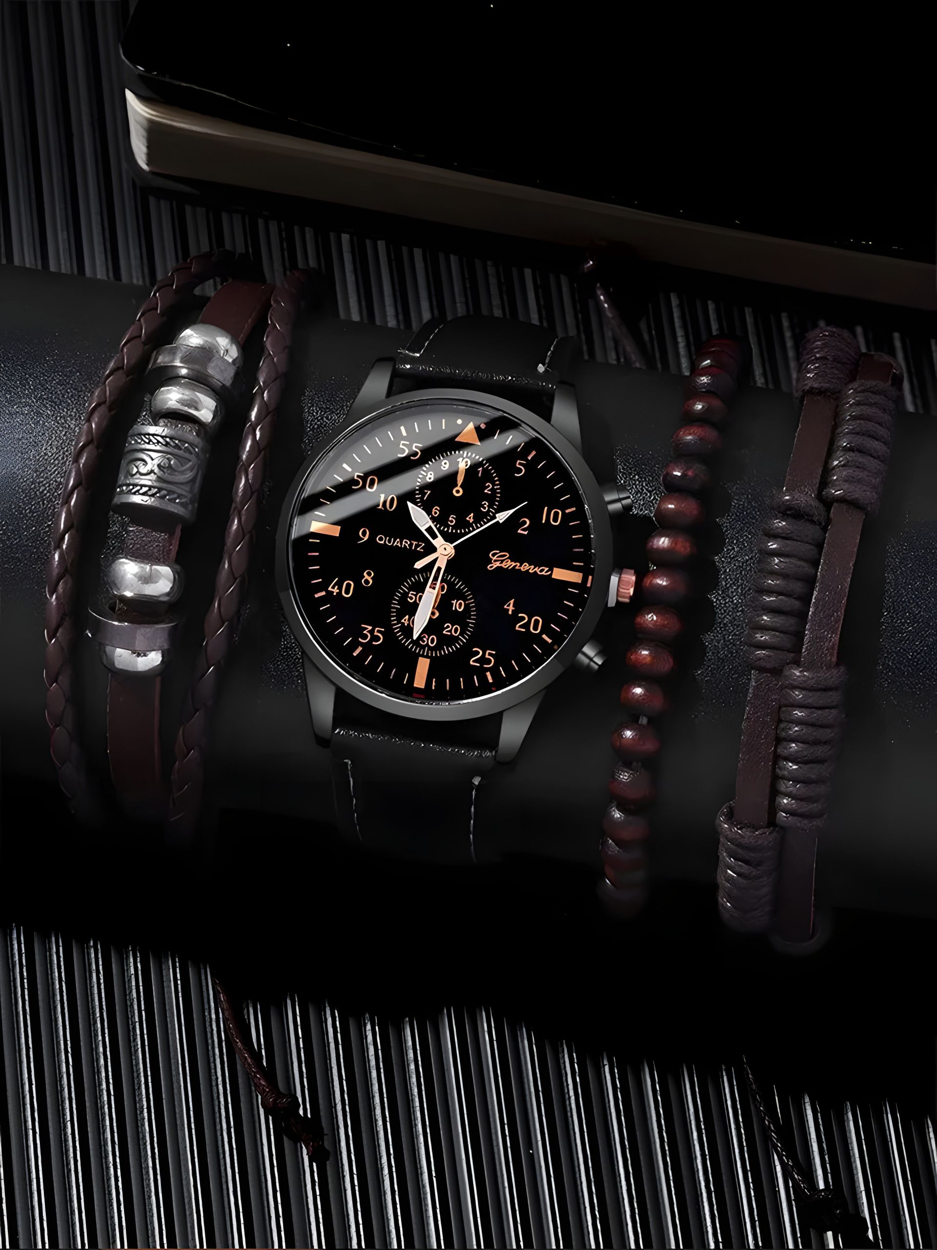 Набор: черные кварцевые часы и браслет из бисера