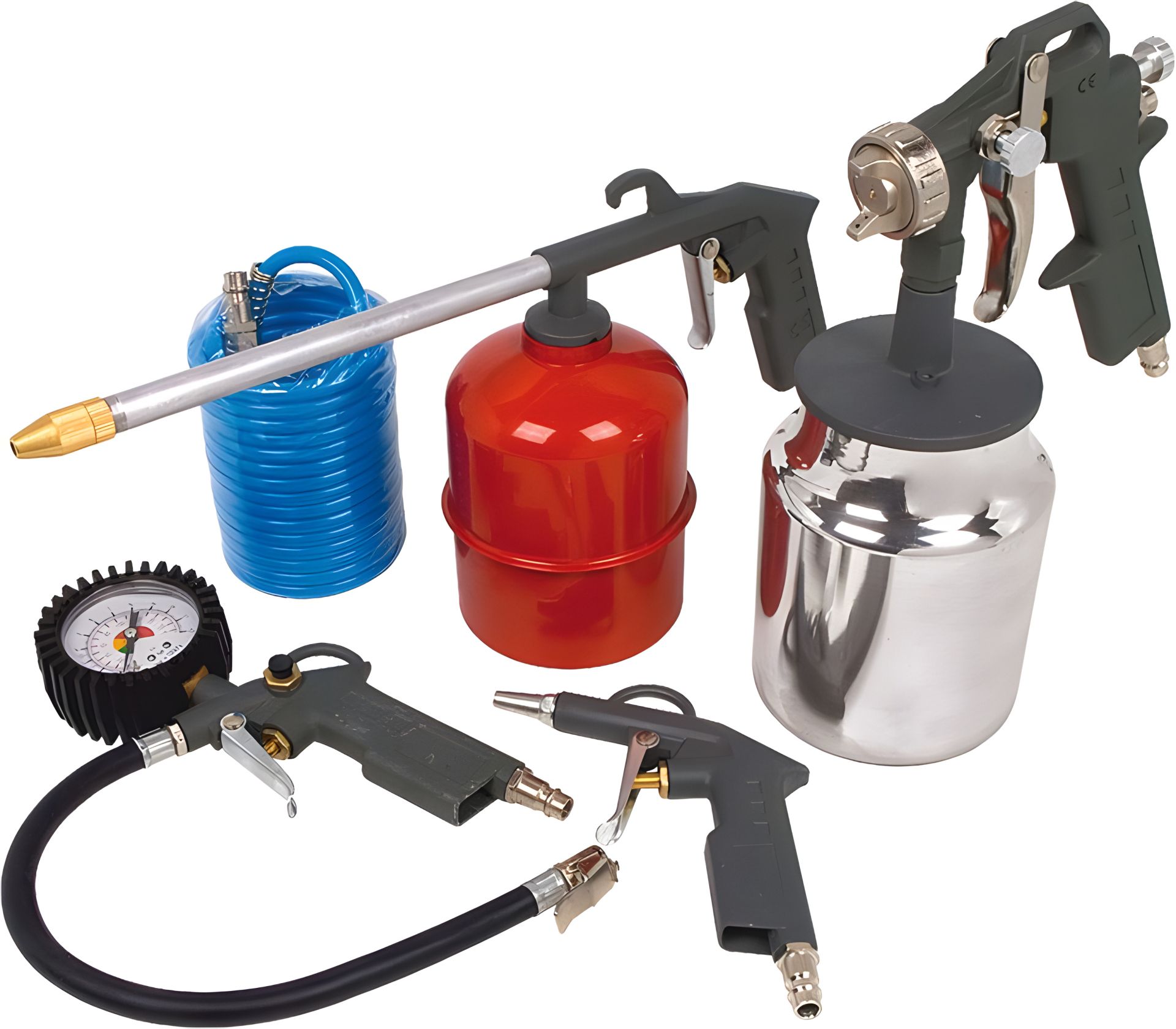 В состав лакокрасочного набора входят шланг полиуретановый 5 м (81-330), краскопульт (80-864), мовиль, пневмопистолет для накачивания колес (81-520), пневмопистолет продувочный (81-500).