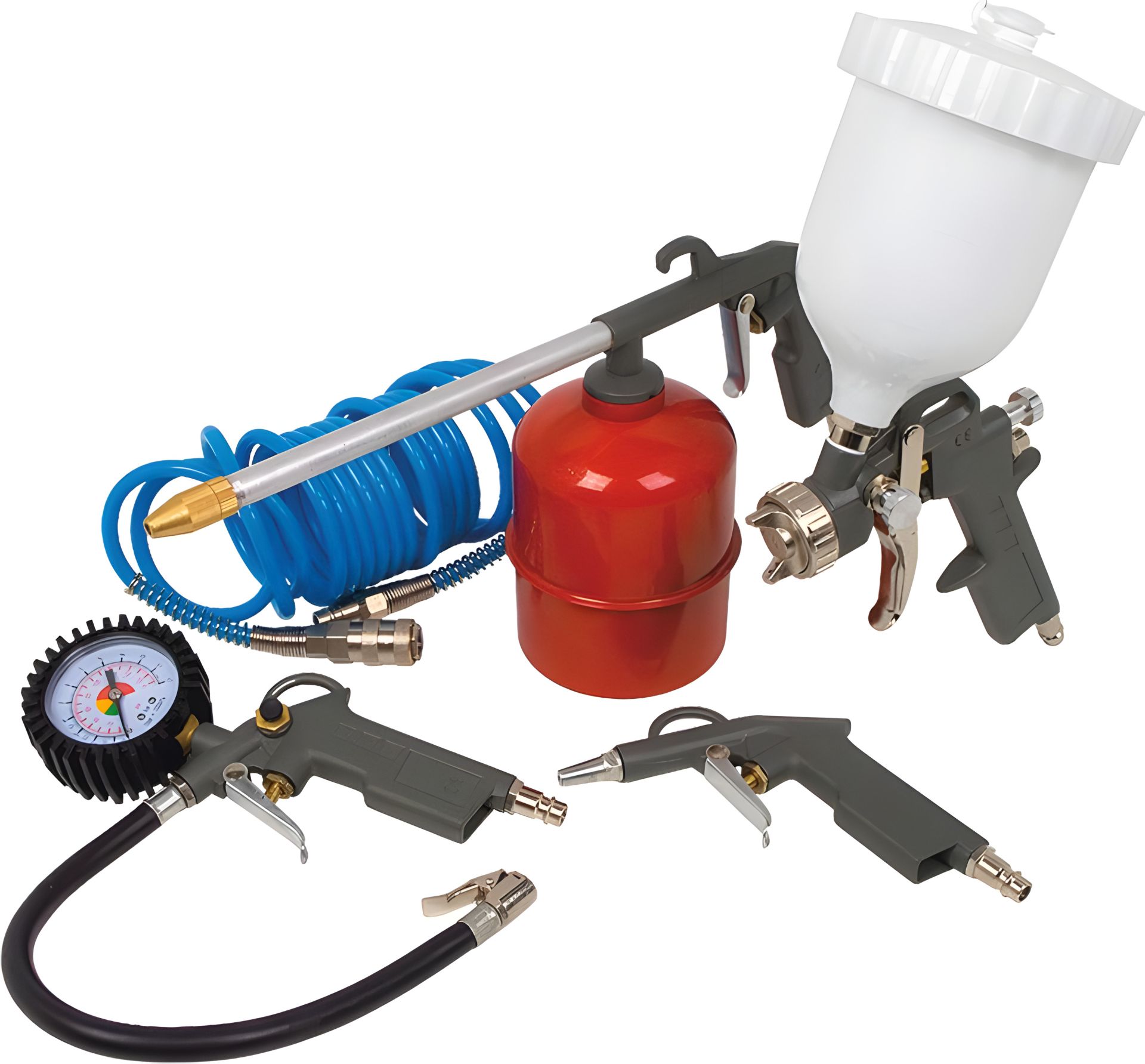 В состав лакокрасочного набора входят шланг полиуретановый 5 м (81-330), краскопульт (80-864), мовиль, пневмопистолет для накачивания колес (81-520), пневмопистолет продувочный (81-500).