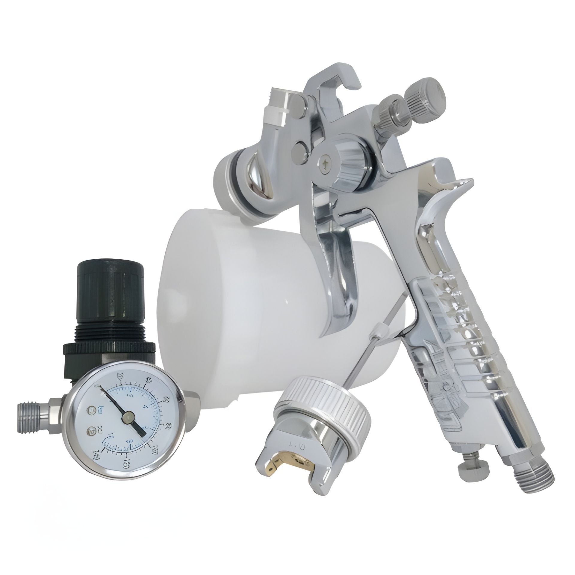 Пневматический покрасочный набор H-827 с воздушным регулятором, тип HVLP, верхний пластиковый бачок, диаметр форсунок 1,3 и 1,7 AUARITA KIT-H-827-1.3-1.7
