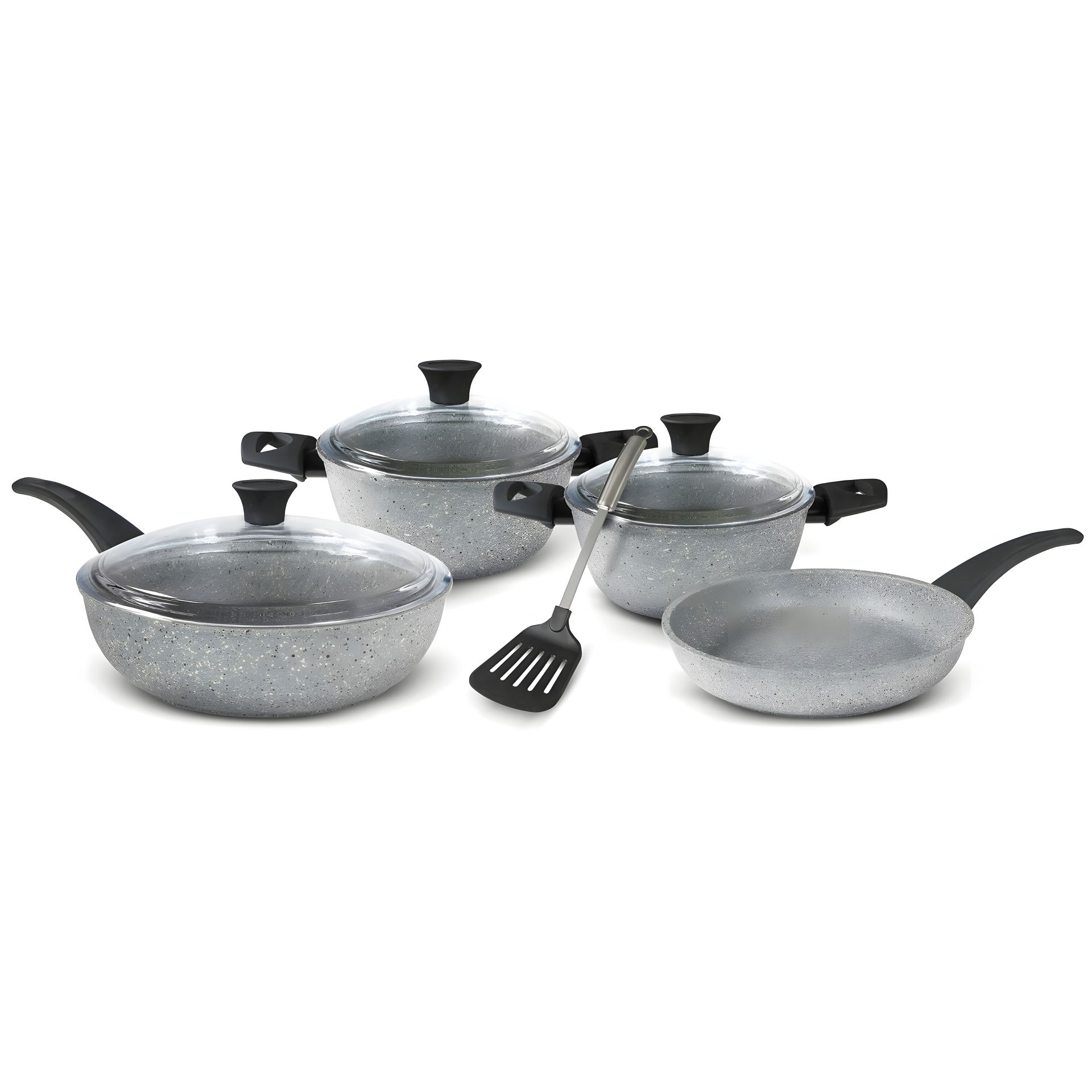 Набор посуды для приготовления пищи Flonal Dura Induction состоит из 8 предметов, а именно из двух сковородок, двух кастрюль, трех крышек для них, а также в подарок добавлена удобная лопатка для переворачивания пищи в процессе приготовления.