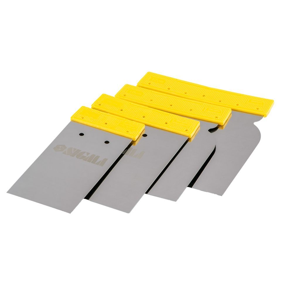 Набор шпателей без рукоятки (нержавеющих) 50, 80, 100, 120мм SIGMA (8321571) применяются для оштукатуривания наружных и внутренних стен, потолков. Для нанесения шпатлевок, мастик и густых клеевых смесей.