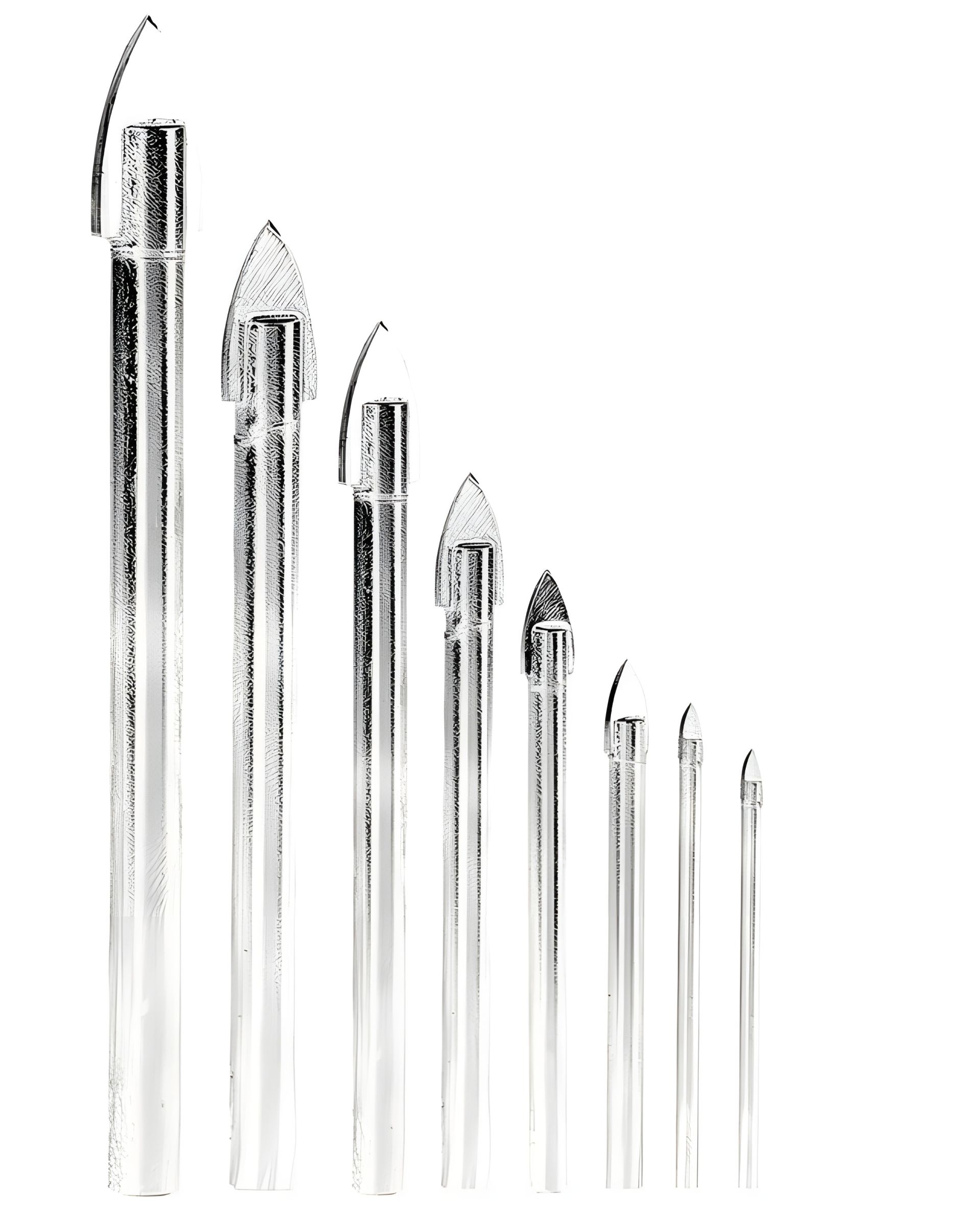 Набор сверл-пик для стекла и керамики 8 шт 4х60/5х65/6х68-2 шт/8х70-2 шт/10х85/12х90 мм — универсальный комплект для точного сверления отверстий в стекле, керамической плитке, зеркалах и фарфоре без образования трещин или сколов.