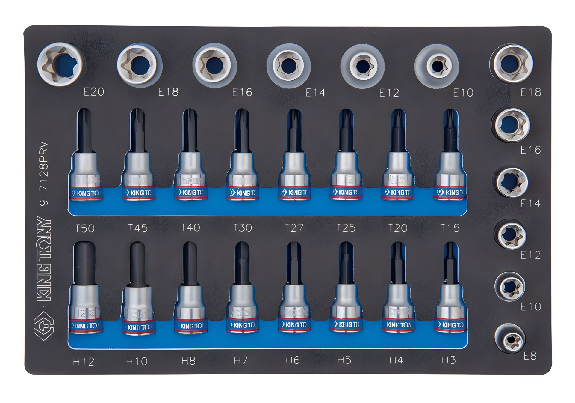 Набор торцевых головок 1/2"&3/8", TORX, HEX, Е6-Е20, ложемент, 28 предметов KING TONY 9-7128PRV