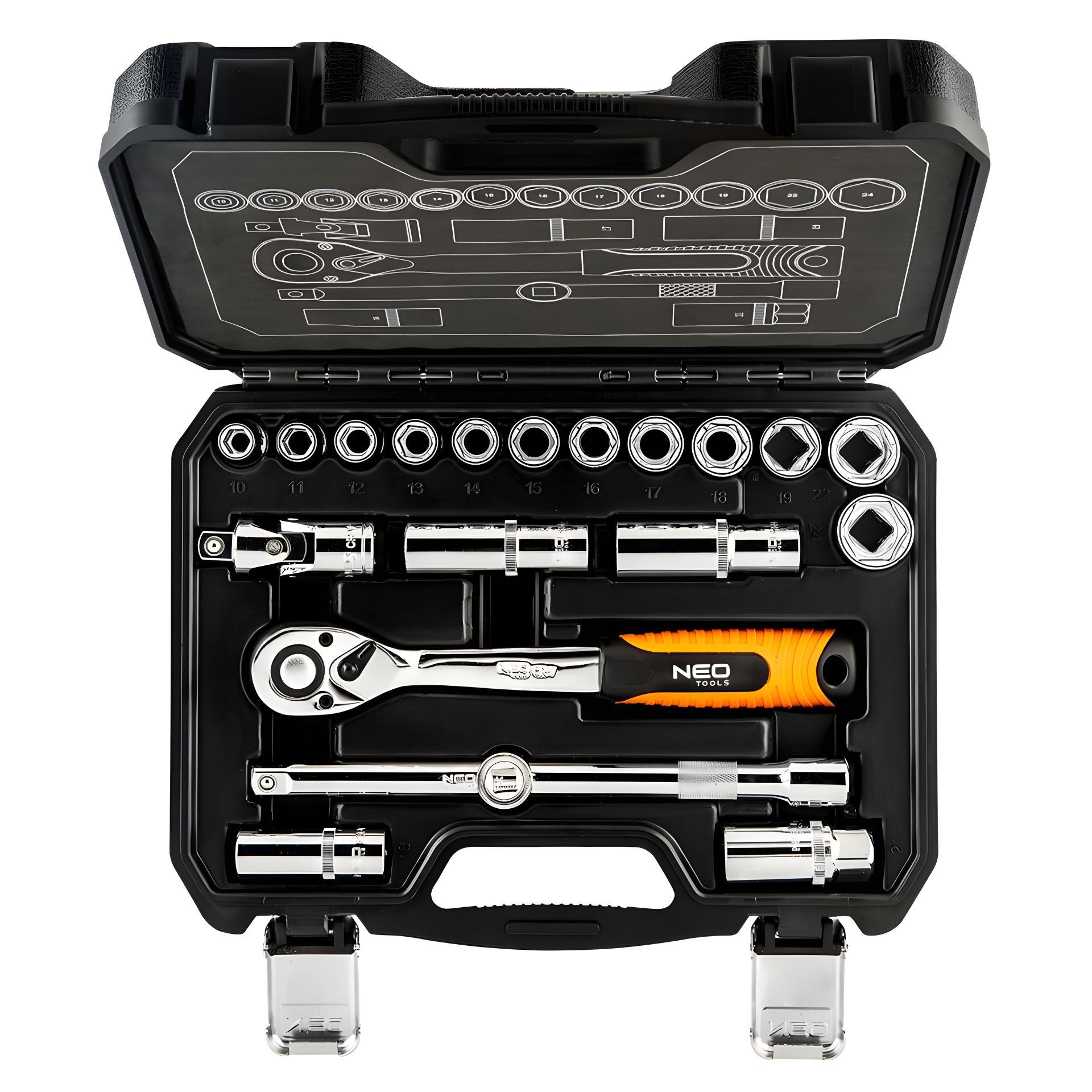 Набор торцевых ключей 1/2" NEO, состоит из 20 предметов, изготовленных из высококачественной хромованадиевой стали и упакован в удобный чемоданчик.