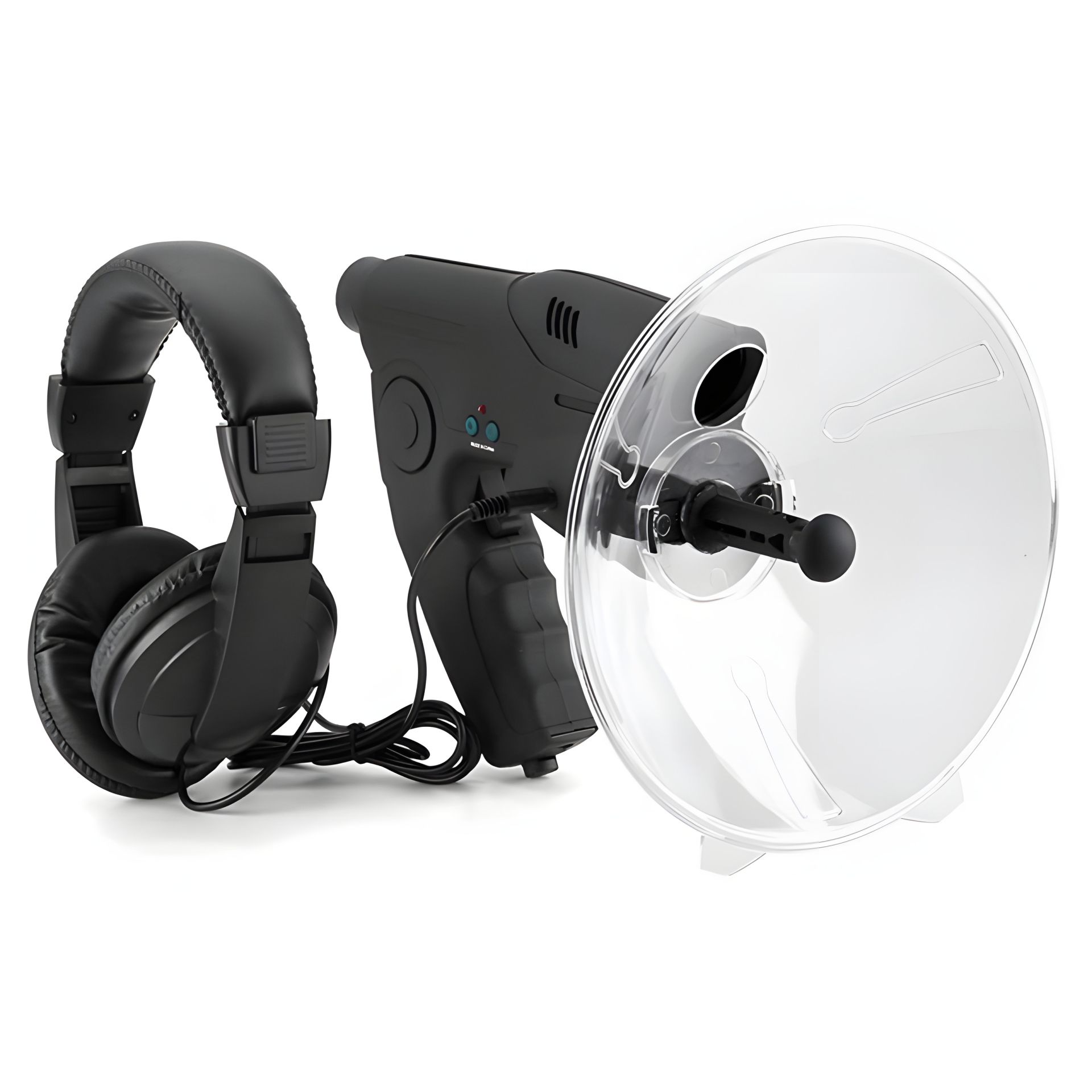В основном блоке находится вся электронная часть, ручка для держания, в которую вставляется батарейка, высокочувствительный микрофон, регулятор чувствительности и монокуляр с 8-ми кратным приближением для нацеливания микрофона. К основному блоку присоединяется улавливающая пластиковая параболическая тарелка, которая необходима для увеличения направленности микрофона. Благодаря параболической форме, улавливаемые звуки отражаются от стенок тарелки и направляются на чувствительный микрофон, где звук усиливается и направляется на наушники.