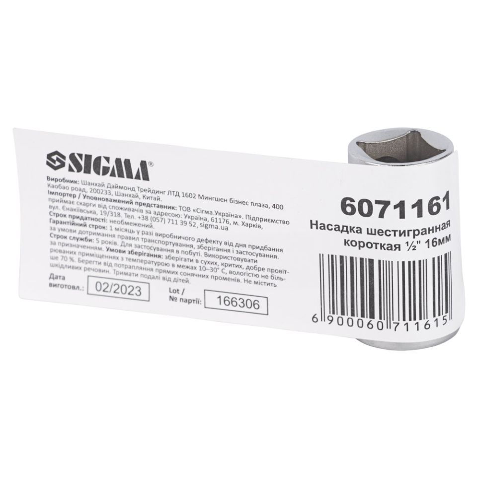 Насадка шестигранная короткая 1/2" 16мм CrV mid SIGMA 6071161