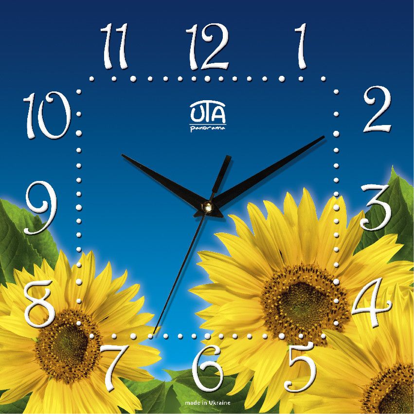Настенные часы ЮТА “Panorama” 300Х300Х16мм UA 021 “Подсолнухи” – имеют квадратную форму.
