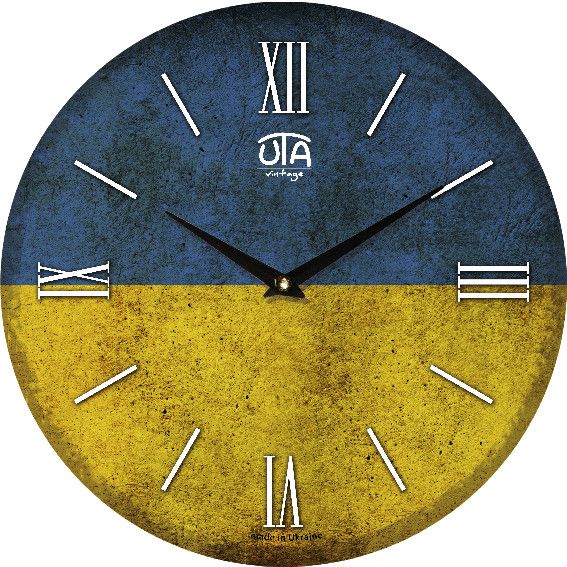 Настенные часы ЮТА “Vintage” (33 cм) 016 VT “Флаг Украины” – имеют круглую форму, диаметр 33 см, толщину 2,7 см, вес 0,6 кг.