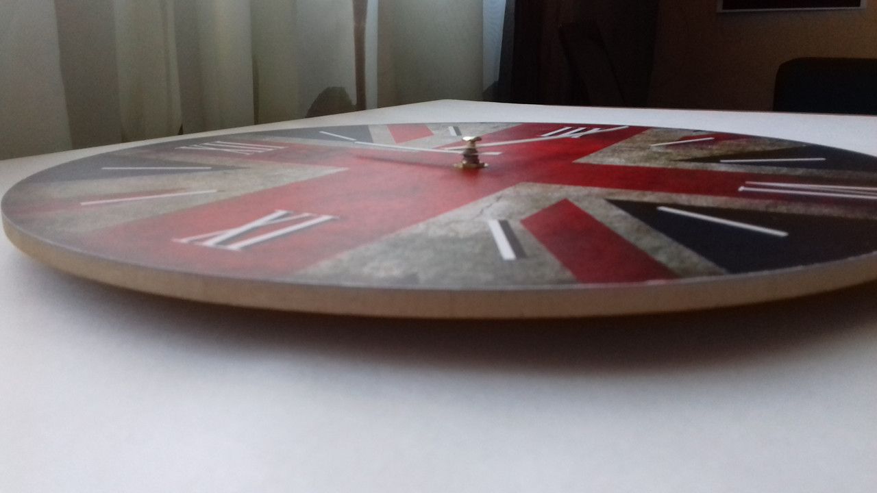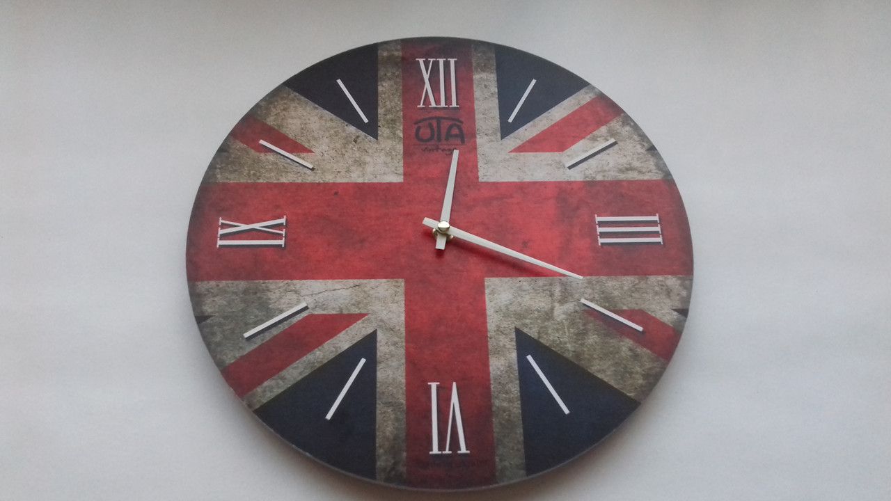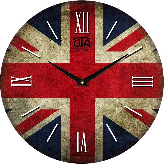 Настенные часы ЮТА “Vintage” (33 cм) 013 VT “Флаг Великобритании” – имеют круглую форму, диаметр 33 см, толщину 2,7 см, вес 0,6 кг.