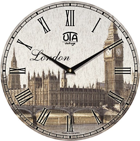 Настенные часы ЮТА “Vintage” (33 cм) 006 VT “Лондон” – имеют круглую форму, диаметр 33 см, толщину 2,7 см, вес 0,6 кг.