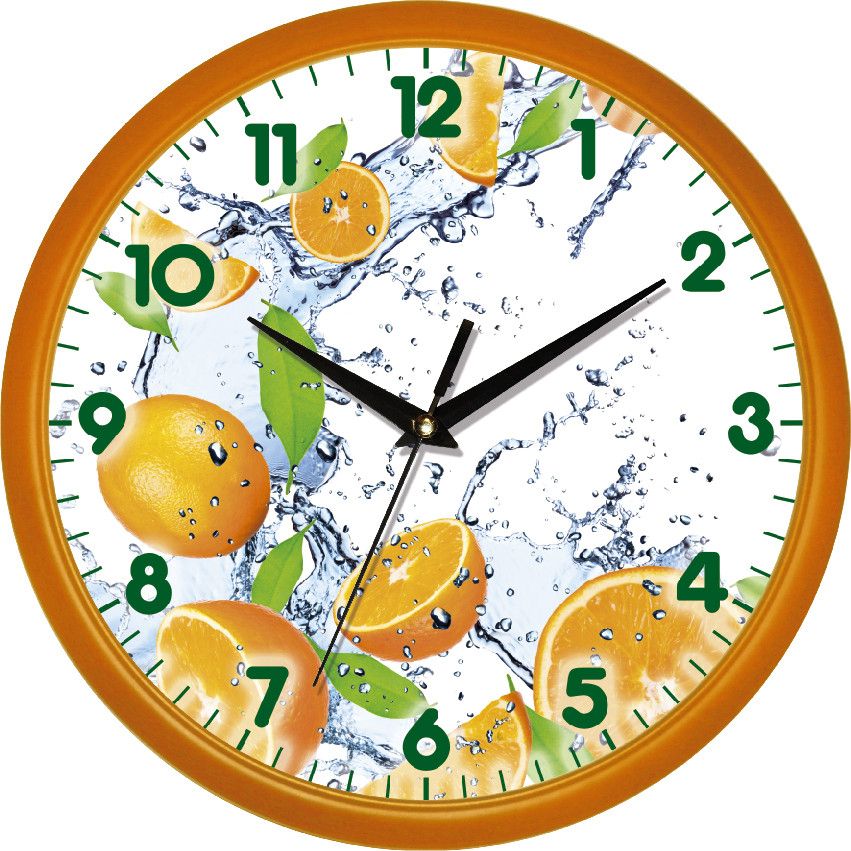 Настенные часы в кухню ЮТА “Классика” (30 cм) 01 Or 74 “Цитрусы” характеризуются круглой формой, диаметром 30 см, толщиной 4,5 см, вес 0,35 кг. предназначены для индикации текущего времени в часах и минутах.