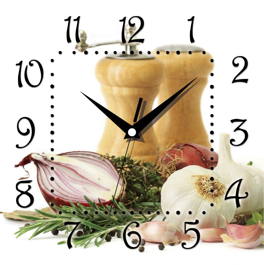 Настенные часы в кухню ЮТА “Панорама” 300Х300Х16мм K – 009 “Соль и перец” – имеют квадратную форму.