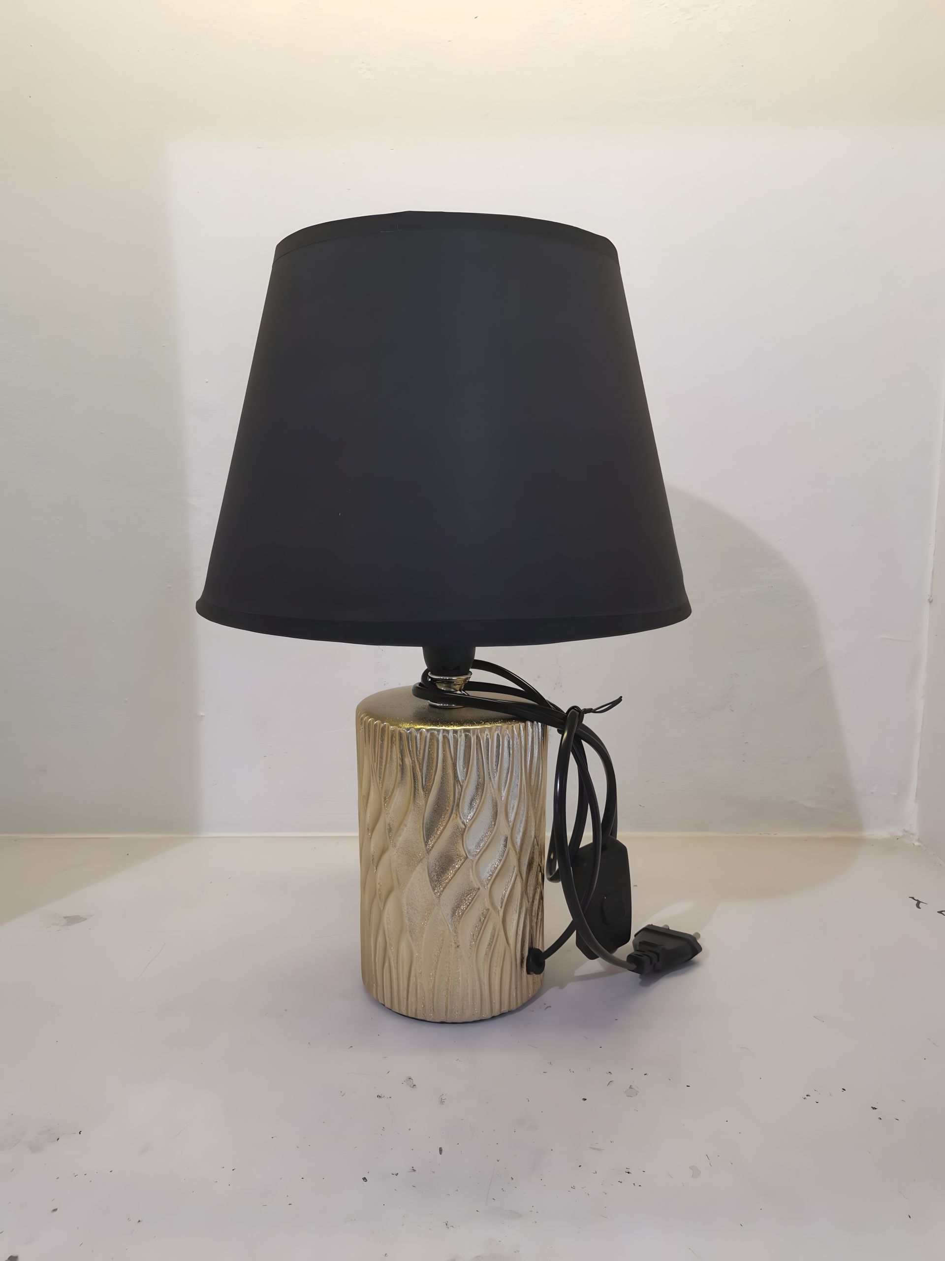 Основа лампы изготовлена из керамики и покрыта золотым цветом (BG), что придает изделию изысканность и эстетическое совершенство. Эта роскошная база отлично контрастирует с черным текстильным абажуром, который эффективно рассеивает свет, создавая комфортную атмосферу в помещении.