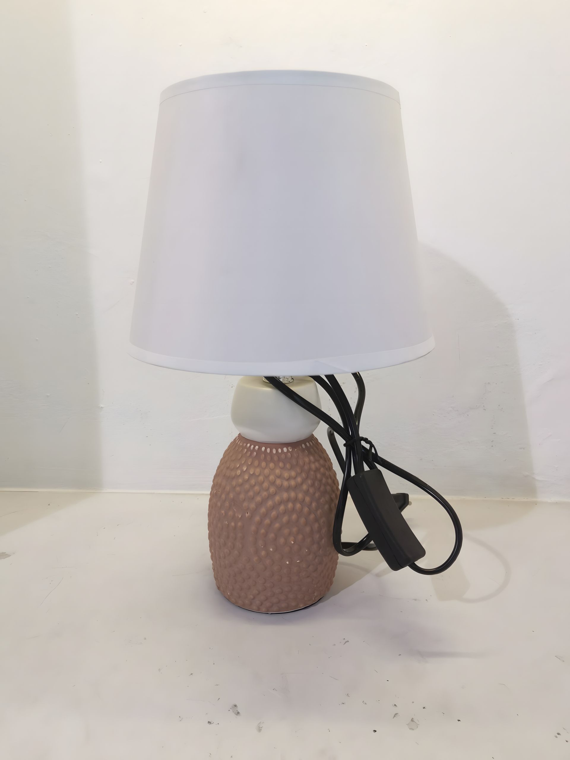 Лампа имеет керамическую основу в коричнево-белом цвете, которая выглядит сдержанно и в то же время роскошно. Белый текстильный абажур мягко рассеивает свет, создавая комфортную атмосферу для чтения, работы или отдыха.