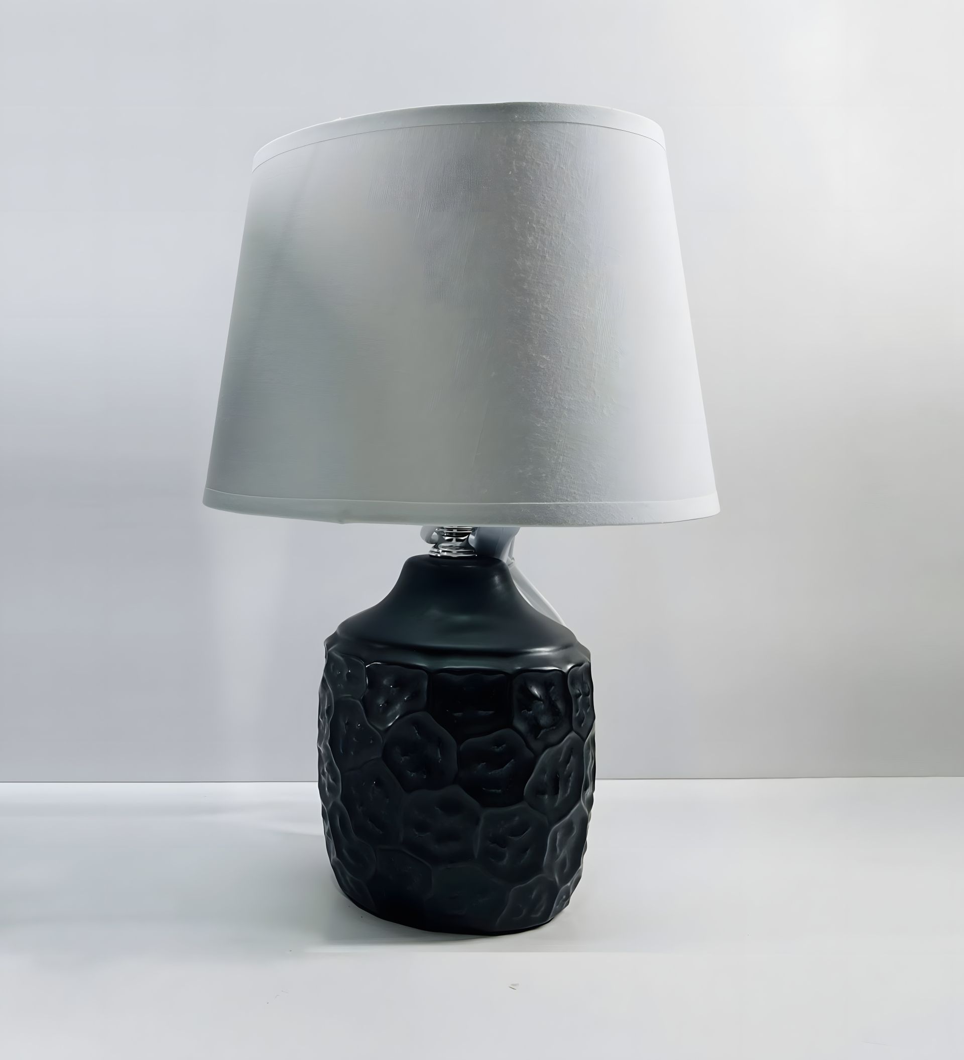 Лампа имеет керамическую основу в черном цвете декором, которая выглядит сдержанно и в то же время роскошно. Белый текстильный абажур мягко рассеивает свет, создавая комфортную атмосферу для чтения, работы или отдыха.