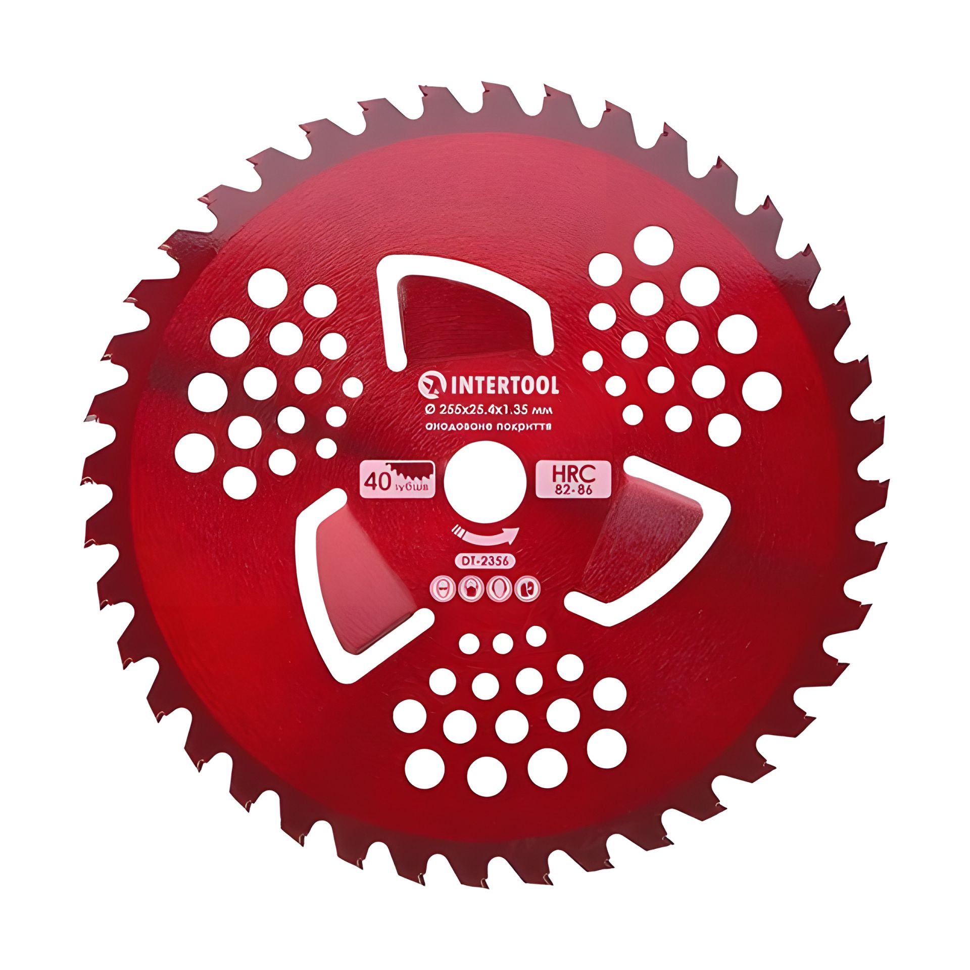 Нож для мотокосы/триммера с твердосплавными напайками ø255x25.4x1.35 мм 40T, HRC 82-86, 3 подрезных лопасти, анодированное покрытие INTERTOOL DT-2356