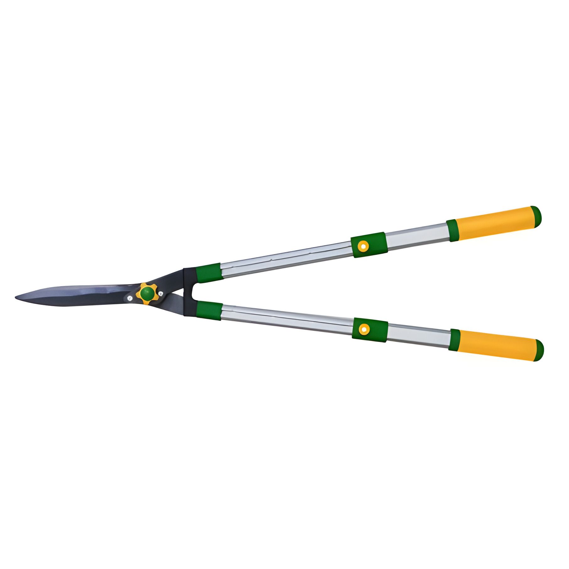 Садовые ножницы длиной 660 мм, лезвия 250 мм х 3,5 мм представляют собой секатор с двумя режущими лезвиями, работающими по принципу обычных ножниц. Волнистые лезвия из стали, верхнее с PTFE покрытием (против налипания), упор для облегчения отдачи от рукояток в процессе реза. Регулируемый зазор между лезвиями. Гайка барашек препятствует самопроизвольной раскрутке лезвий. Длинные облегченные алюминиевые рукоятки с возможностью удлинения до 900 мм обеспечивают естественное положение тела во время работы и позволяют добраться до далеко и высоко растущих веток. Ножницы предназначены для стрижки живой изгороди, тонких веток. Они позволяют проводить срезание пучками травы и могут использоваться для сбора фруктов и винограда. Это универсальный инструмент, без которого не обойтись профессиональному садовнику или ландшафтному дизайнеру.