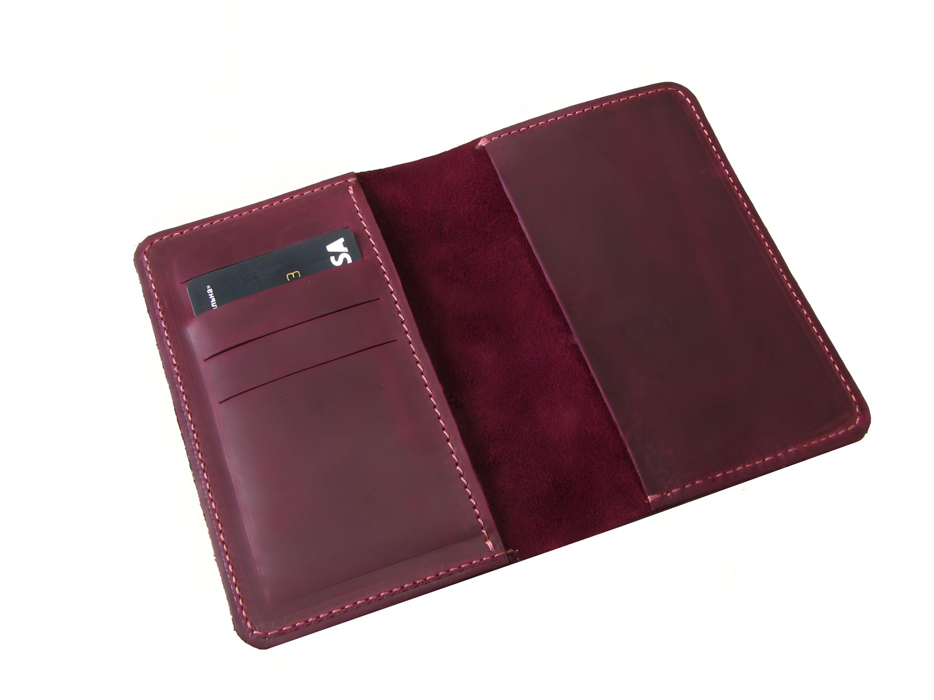 Кожаная обложка для паспорта бордового цвета.