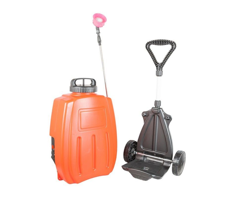 Опрыскиватель установлен на тележке с колесами, что значительно облегчает транспортировку даже при полной загрузке. Имеет гибкий шланг, телескопическую штангу с распылителем и регулируемое сопло для изменения типа струи. Идеально подходит для использования в садоводстве, сельском хозяйстве, теплицах и при дезинфекционных работах. Удобное управление, надежная конструкция и мобильность делают этот опрыскиватель оптимальным выбором для интенсивной работы. • материал бака – ударопрочный полиэтилен