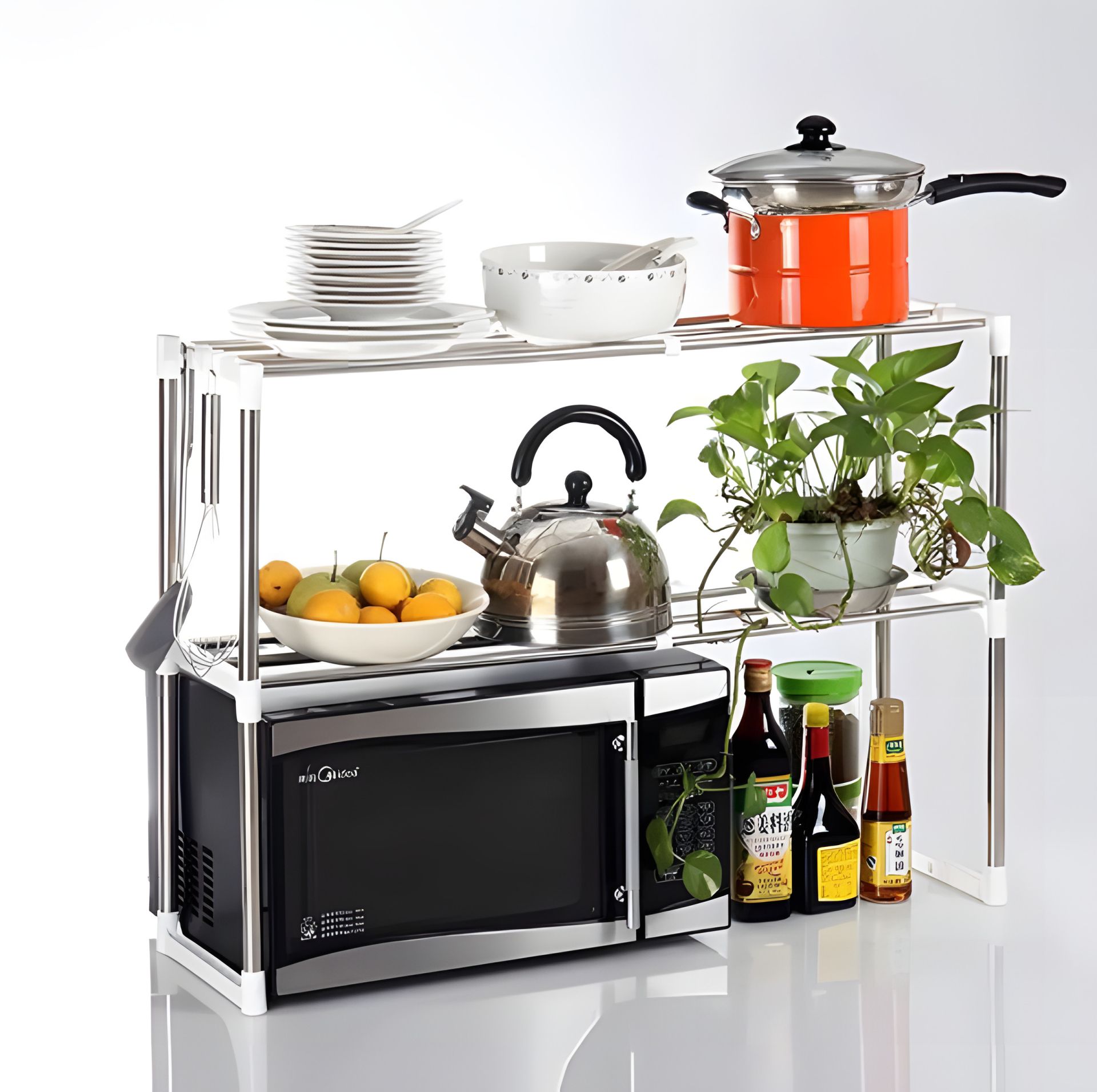 Рама изготовлена из металлических труб, соединенных пластиковыми крепежными элементами. Две широкие полки позволят вам расположить пространство и удобно разместить много кухонных приборов над микроволновой печью.