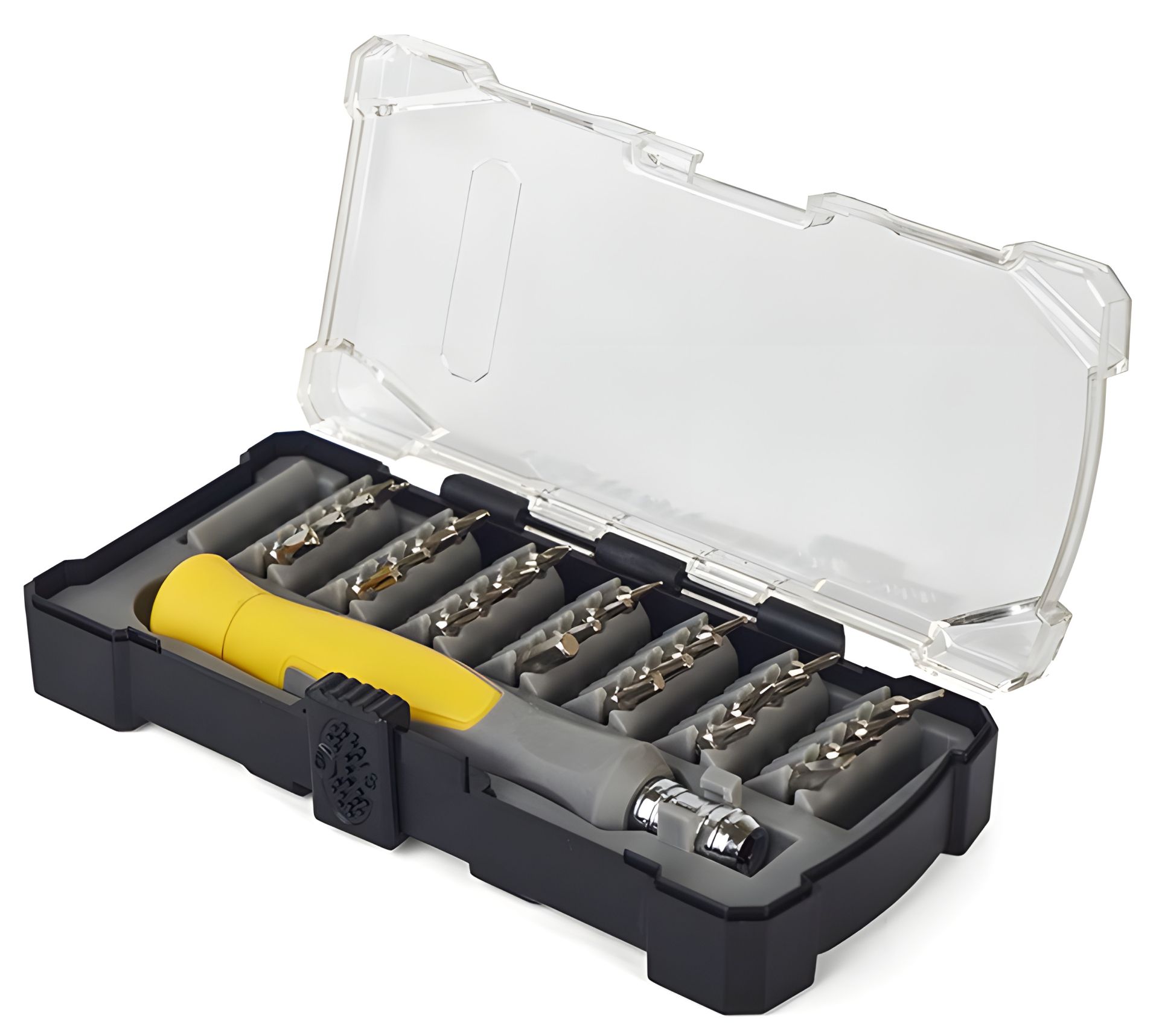 Типоразмеры отверток в наборе: SL1.5, SL2.5, SL3.0, SL4.0, PH000, PH00, PH0, PH1, T5, T8, T10, T15, H0.7, H1.5, H2.0, H4.0, PZ0, PZ1, Y2.0, Y2.3, Y2.5, Y3.0, *2.0, *3.0, U2.6, Δ2.0, Δ2.3, Δ3.0. Количество 29 шт.
