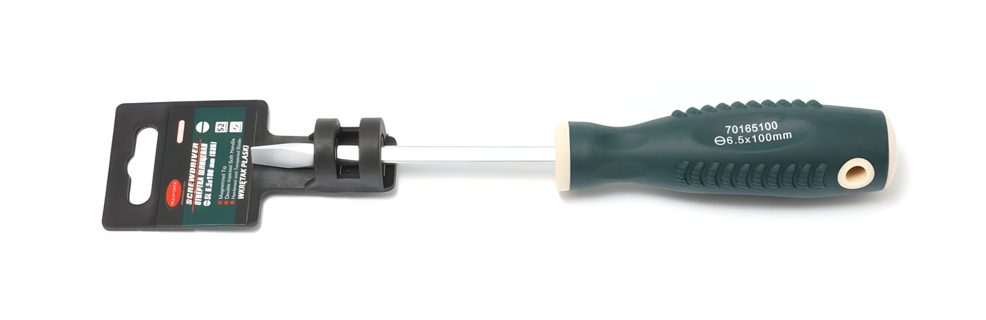 Шлицевая отвёртка ROCKFORCE RF-70165100 магнитная "Profi" S2 6.5x100 мм, на пластиковом держателе упрощает монтаж и демонтаж крепежа. Профилированная отвёртка существенно облегчает процесс работы с винтами.