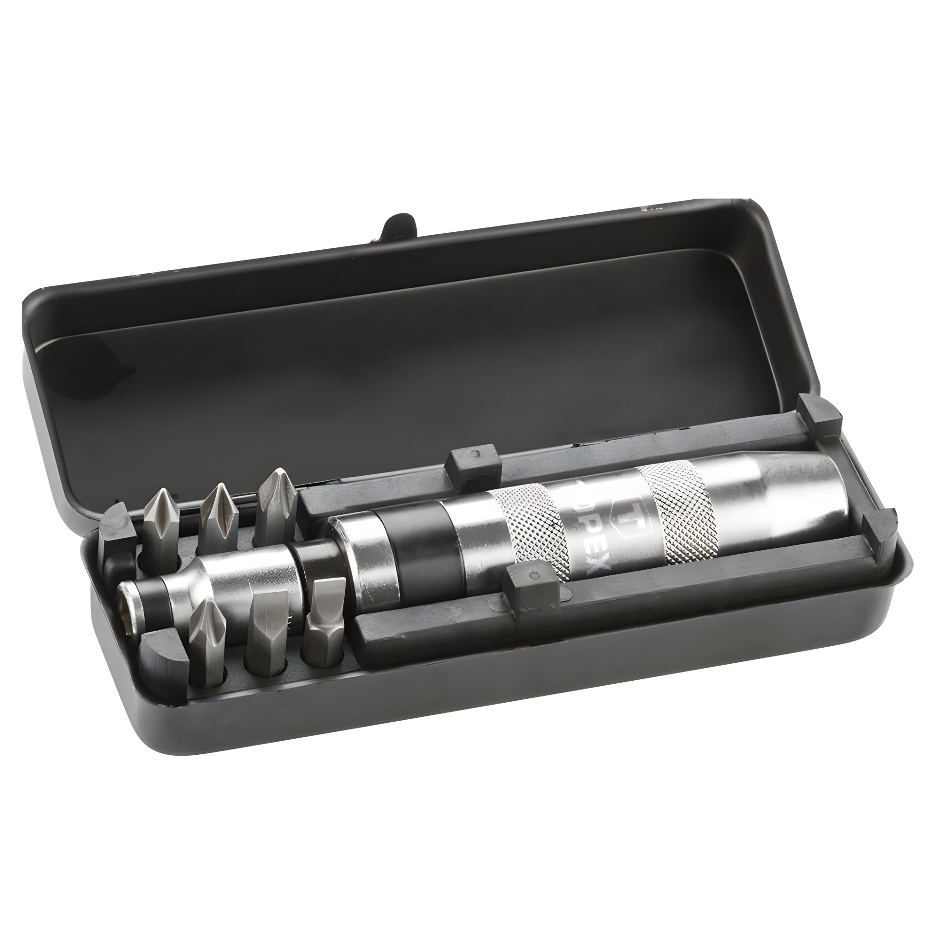 Отвертка ударная, набор 7 шт., отверточная рукоятка 1/2, переходник для сменных наконечников 1/2 x 5, 16, 5 сменных наконечников 35 мм, шлицевые 7 мм, 8 мм, крестовые PH2, PH3, 2 сменных наконечника 75 мм, размеры: 8 мм, PH3 Topex 39D556