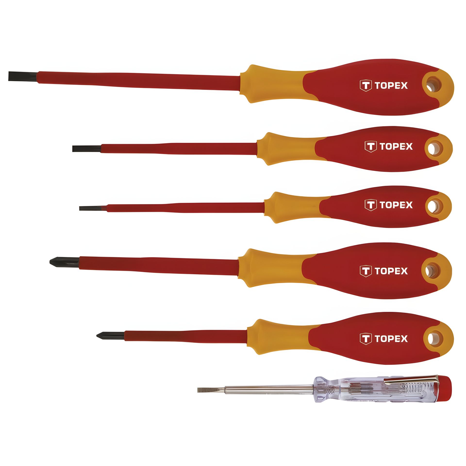 Отвертки 1000 В, набор 6 шт., с сертификатом, сталь CrMo, двухкомпонентная рукоятка, размеры: 3 x 100 мм, 4 x 100 мм, 5.5 x 100 мм, PH1 x 80 мм, PH2 x 100 мм, индикатор напряжения 125-250 В Topex 39D150