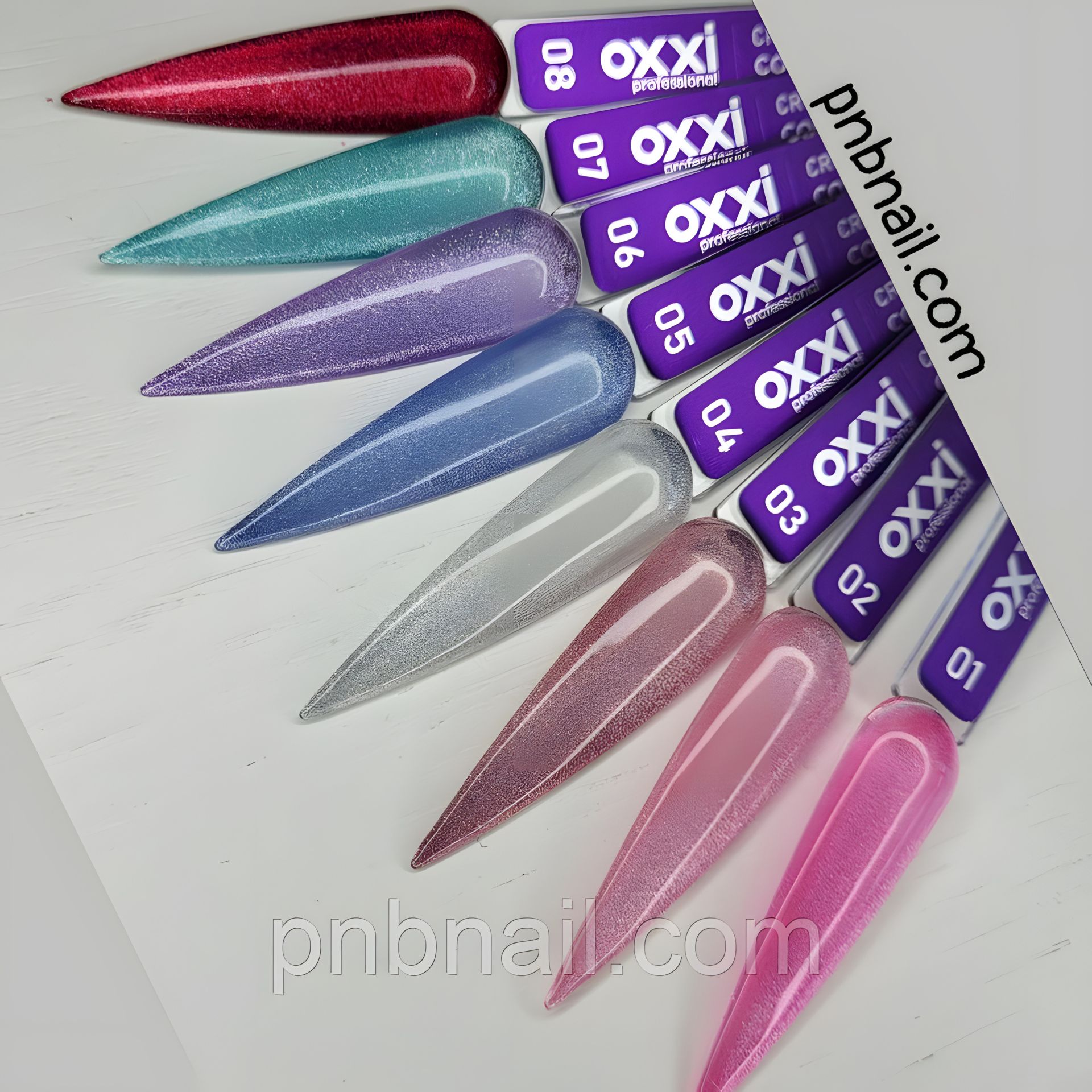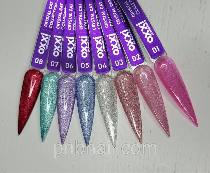 Гель-лак Oxxi Crystal Cat - оригінальне покриття з мерехтливими, об'ємними переливами мікрочастинок, які формують химерні глибокі малюнки на нігтях, створюють ефектний дизайн, надають манікюру рис загадковості та особливого шику. Гарну блискучу смужку, що імітує котяче око, можна зробити за допомогою спеціального магніту.