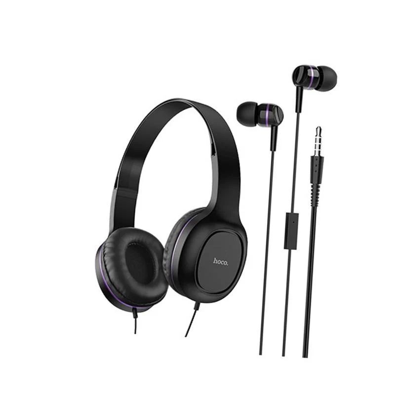 Hoco W24 Enlighten — это комплект из двух типов проводных наушников: полноразмерные накладные и компактные вакуумные. Обе модели оснащены встроенным микрофоном и пультом управления на кабеле, позволяющим переключать треки, регулировать громкость и принимать звонки без необходимости доставать устройство.
