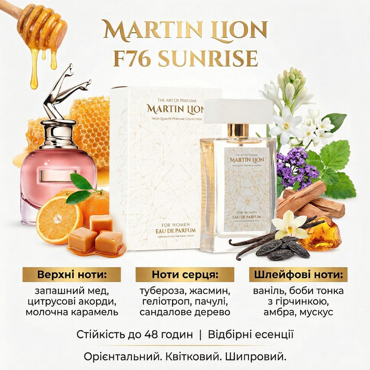 Верхние ноты: душистый мед, цитрусовые аккорды, молочная карамель