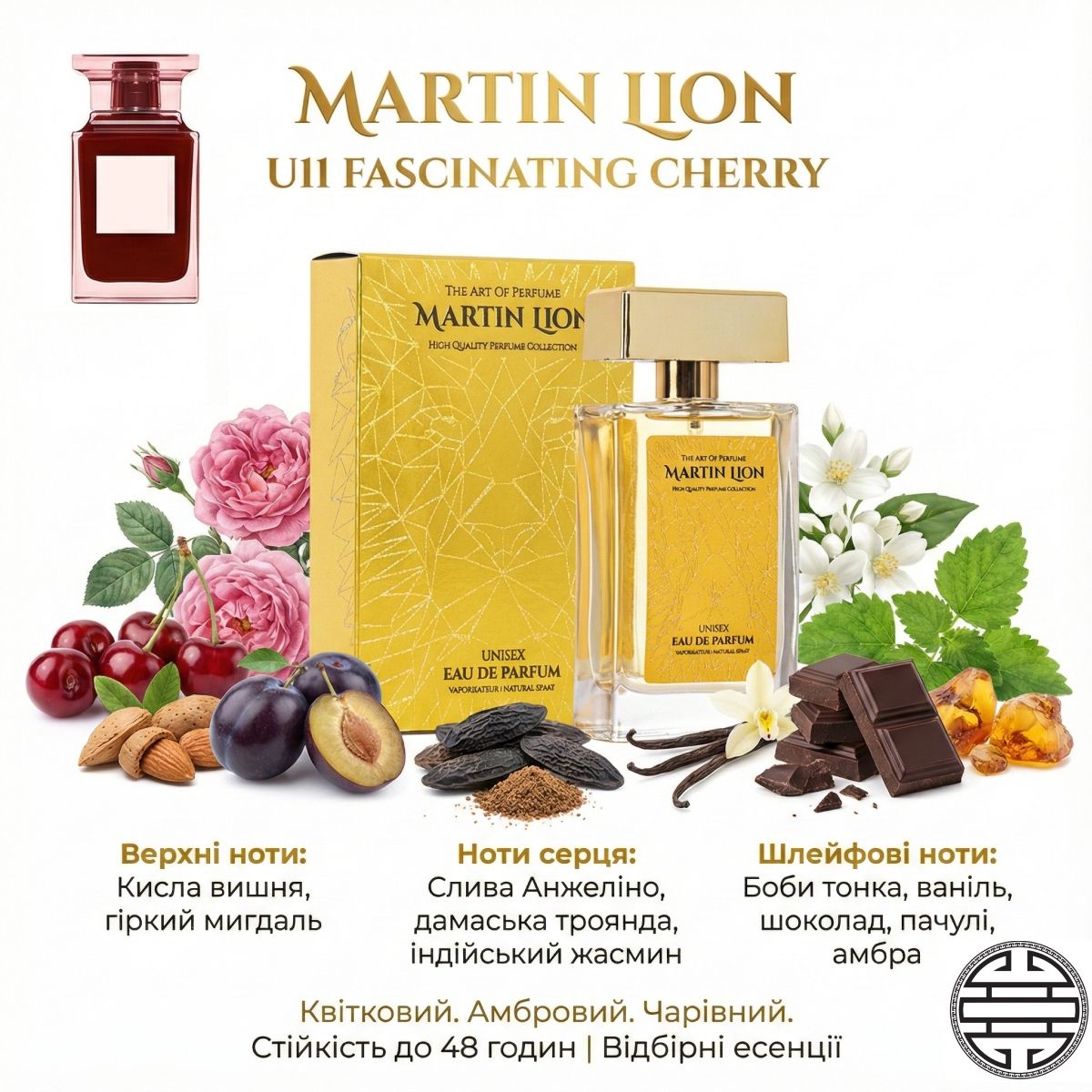 Martin Lion U11 Fascinating Cherry — це вибух чуттєвості та емоцій, втілений у кожній ноті. Перші акорди кислої вишні та гіркого мигдалю — як спокусливий дотик, який викликає бажання відчути більше. Далі композиція розкривається п'янкою солодкістю сливи, троянди та жасмину, створюючи атмосферу пристрасті та загадковості.