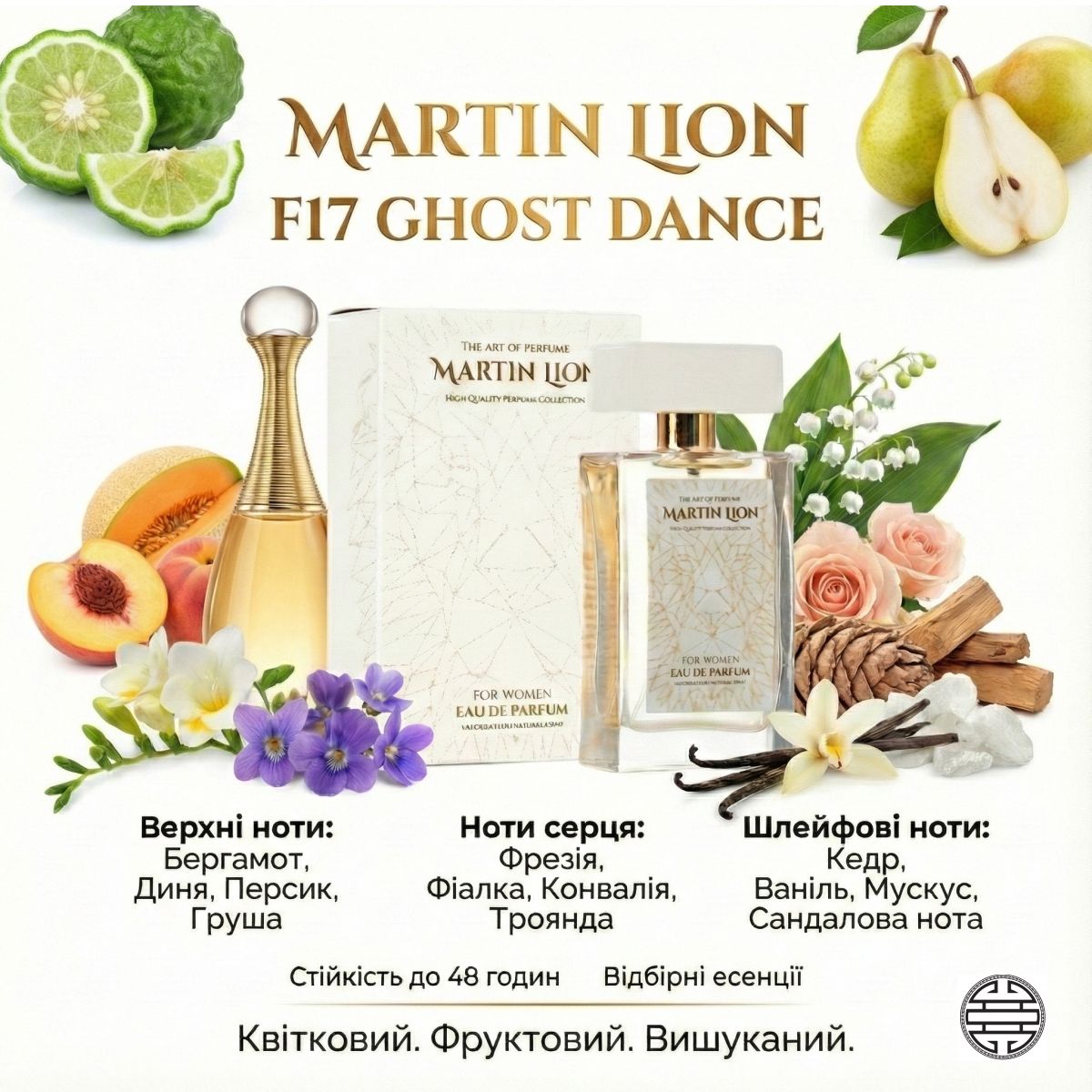 Martin Lion F17 Ghost Dance — аромат, наполненный солнцем, нежностью и вдохновением. Цветочно-фруктовая композиция переносит вас на летний берег, где каждый аккорд вызывает улыбку и лёгкое головокружение от счастья.