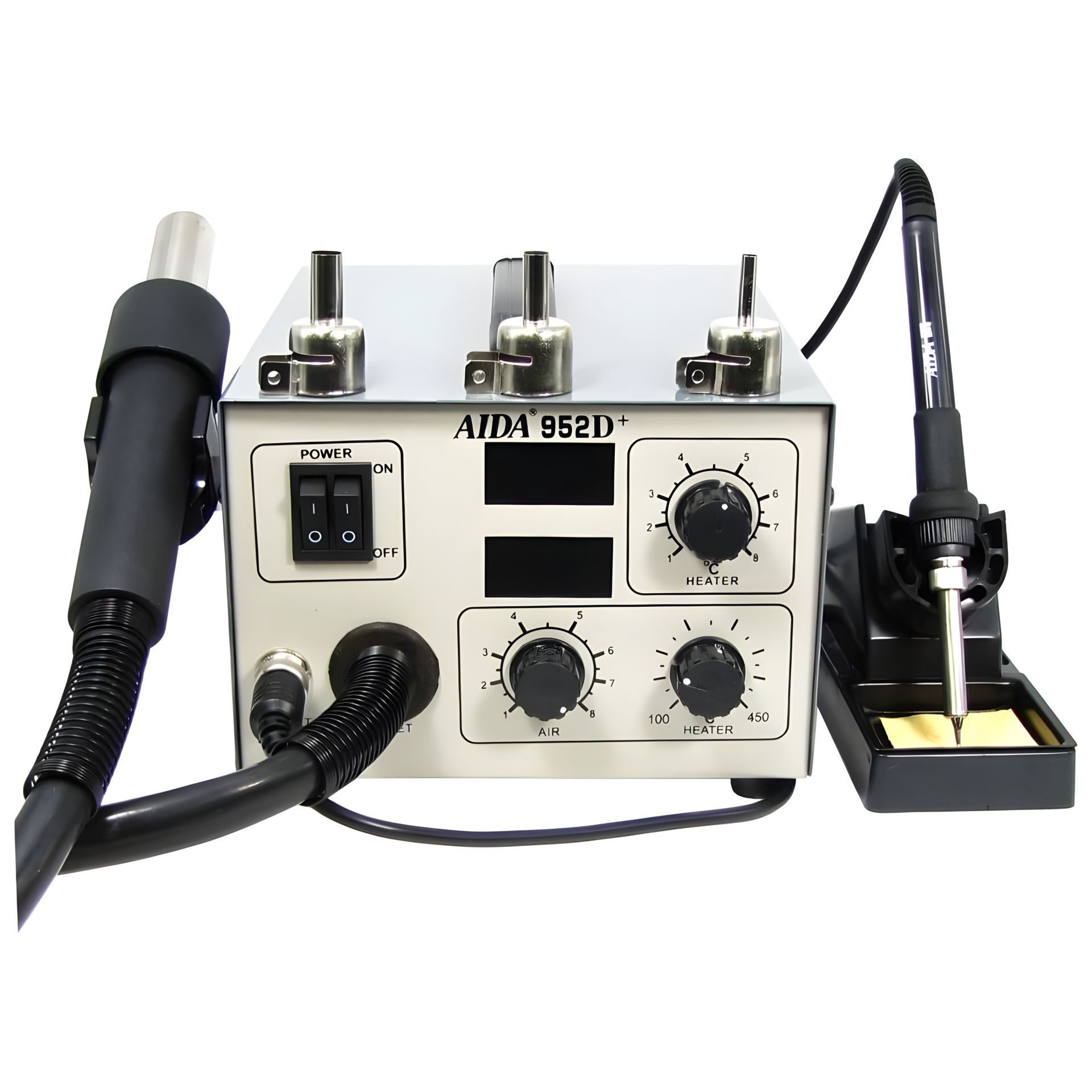 Паяльная станция AIDA 952D+ — это профессиональное оборудование для монтажа и демонтажа электронных компонентов, оснащённое термофеном с компрессорной подачей воздуха и высокоточным паяльником. Благодаря микропроцессорному управлению, устройство обеспечивает стабильный и точный контроль температуры, позволяя выполнять широкий спектр работ от пайки SMD-компонентов до ремонта печатных плат с BGA-микросхемами.