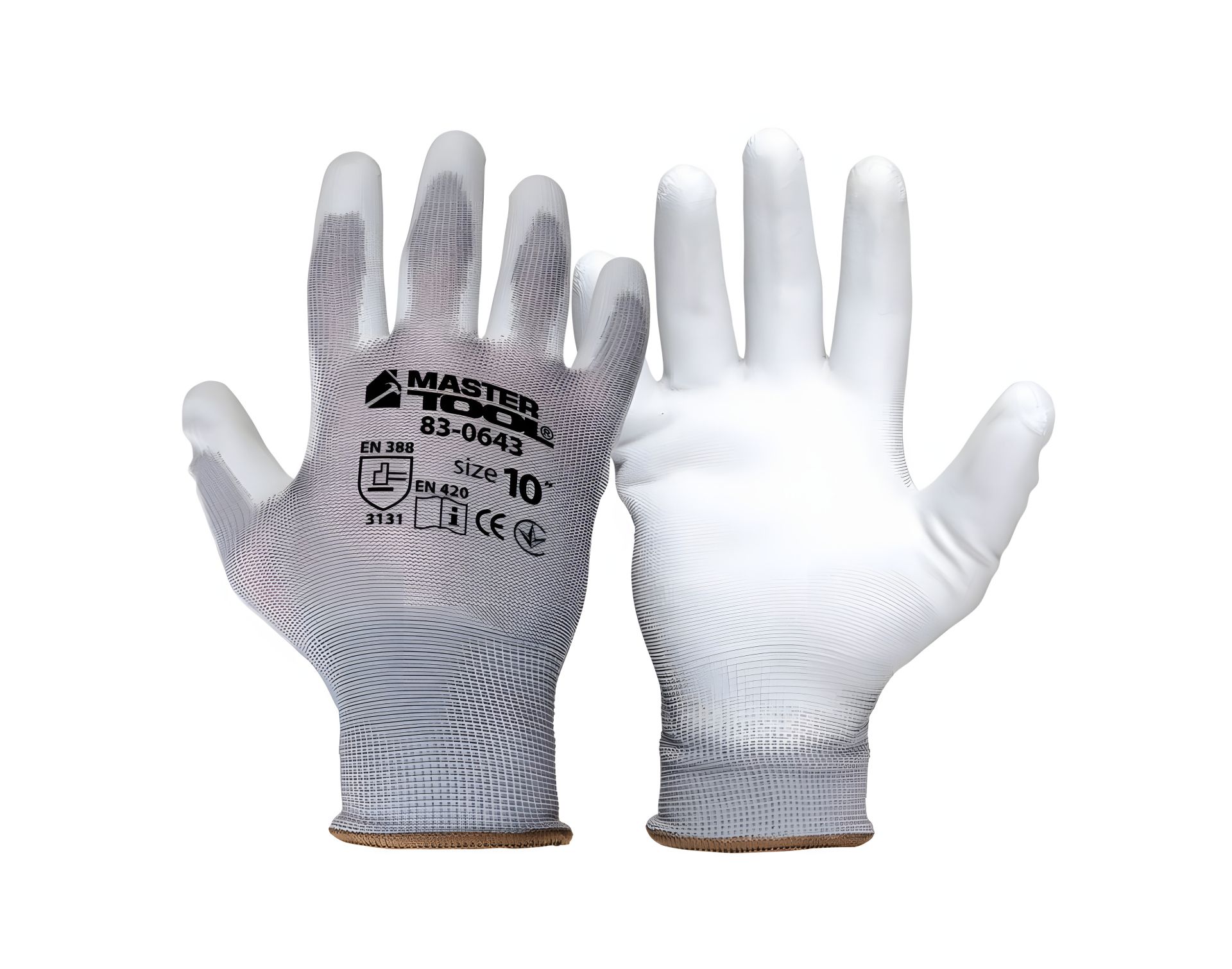 Бесшовные трикотажные перчатки с полиуретановым покрытием ладони 10" 25-26 г подвес серые MASTERTOOL 83-0643
