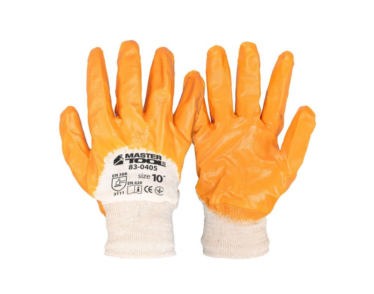 Перчатки хлопчатобумажные трикотажные нитриловое покрытие ¾ вязаный манжет 10" 12 пар оранжевые MASTERTOOL 83-0405doz