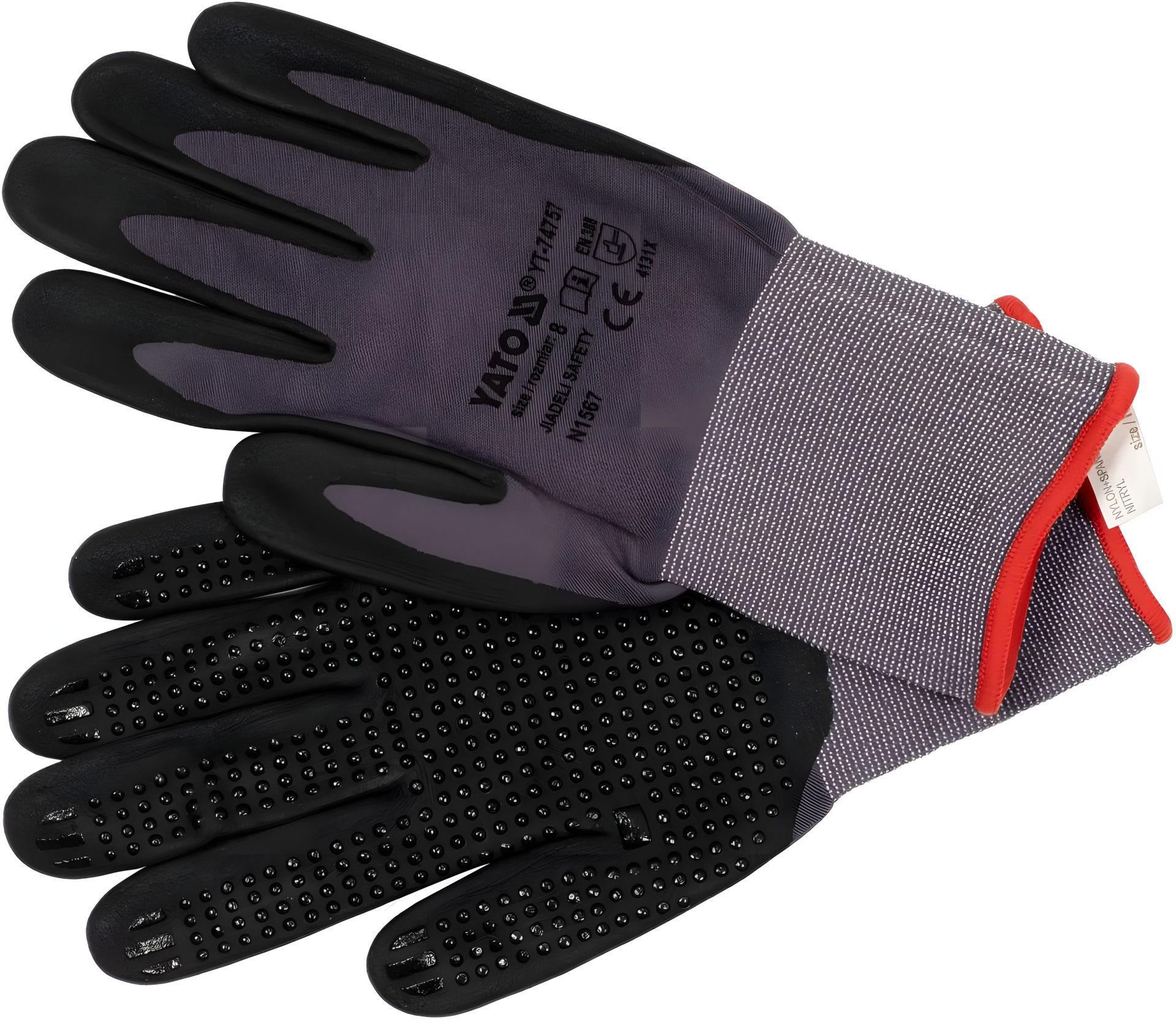 Перчатки рабочие нейлоновые YATO покрытые вспененным нитрилом с накраплением, размер 8, черн-серые.