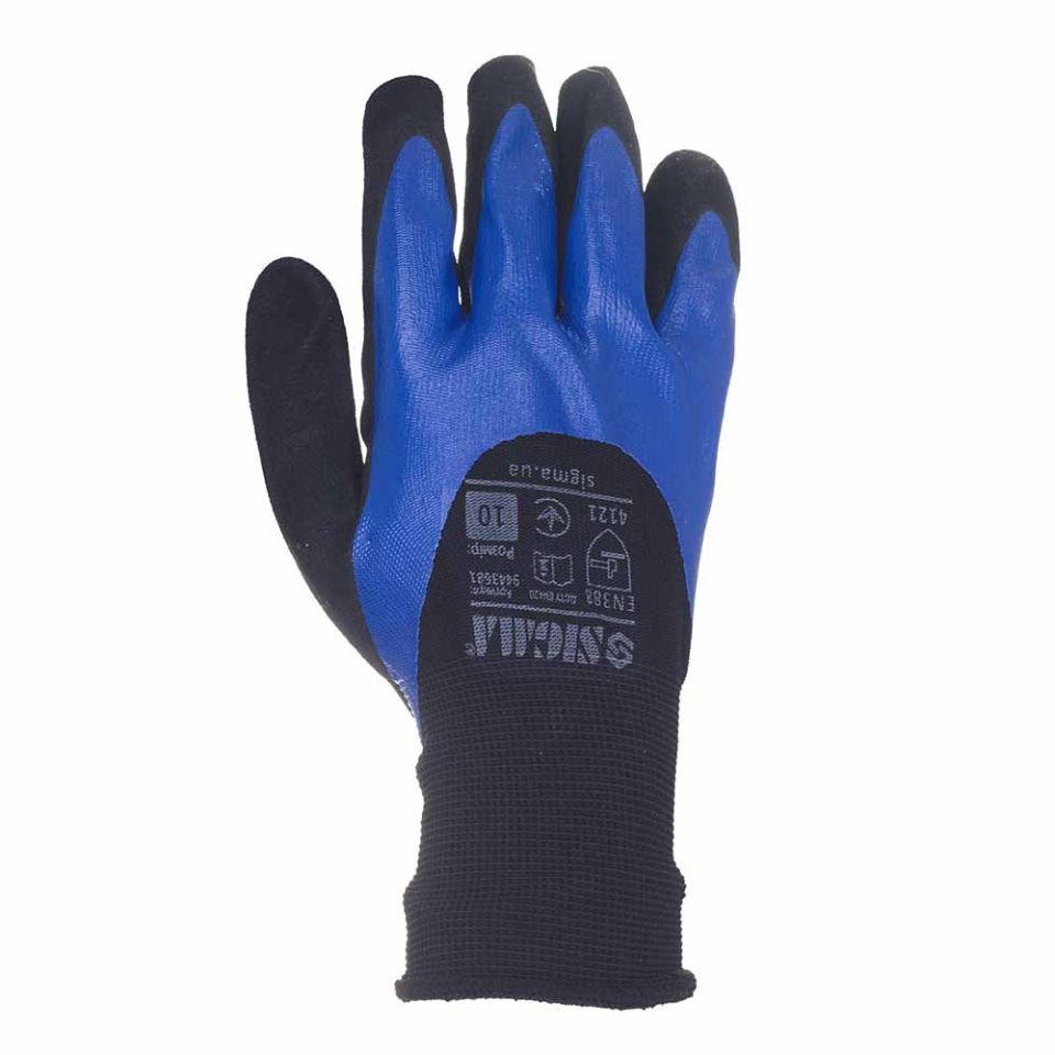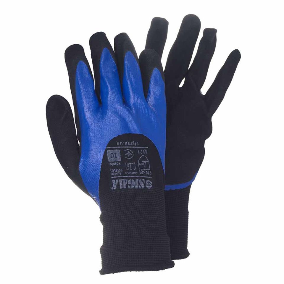 Перчатки трикотажные с двойным нитриловым покрытием р10 (сине-черные, манжет) SIGMA (9443681) предназначены для защиты от механических воздействий, жира и масла. Оптимально подходят для работ, где необходима высокая точность.