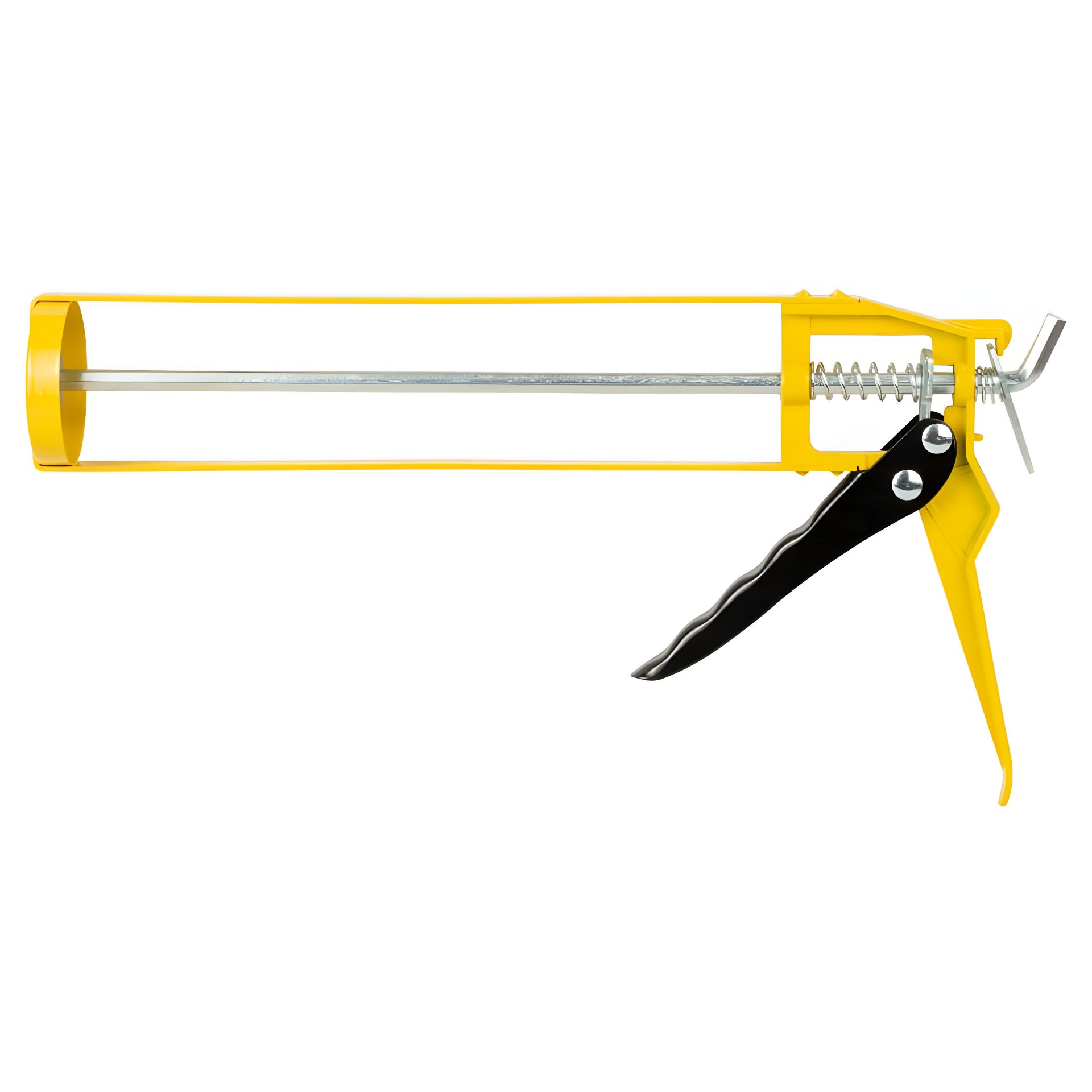 Конструкция состоит из курка, ручки, корпуса и штока. Корпус скелетного типа служит емкостью для тубы с герметиком. Принцип работы следующий: нажатие на курок приводит в движение шток, который в свою очередь двигает поршень внутри тубы с герметиком, создавая давление, в результате которого содержимое выходит наружу.