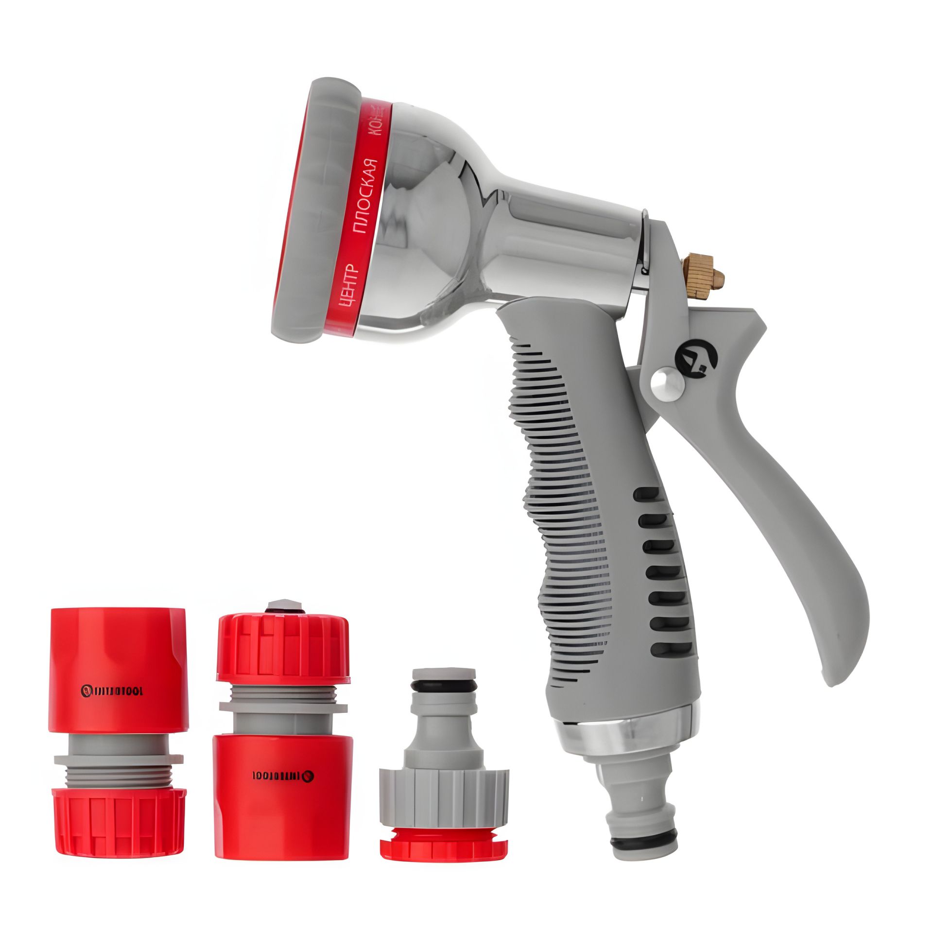 Хромированный пистолет-распылитель для полива, 8 режимов, материалы: ABS, PP, TPR, Zinc alloy, с набором аксессуаров для подключения INTERTOOL GE-0005