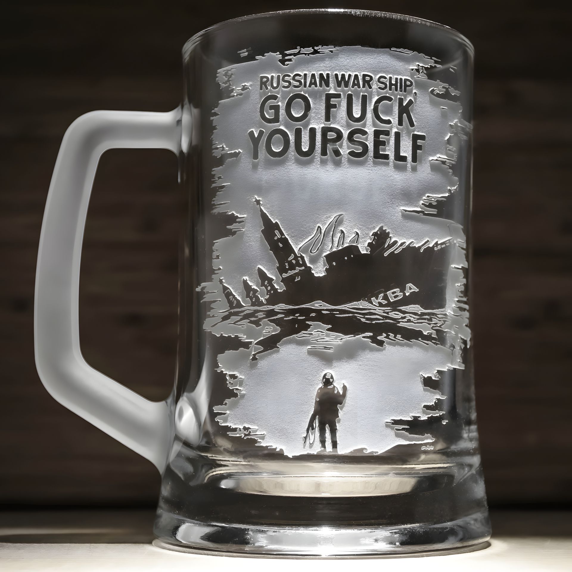 Гравированный пивной бокал с надписью "russian war ship go fuck yourself"