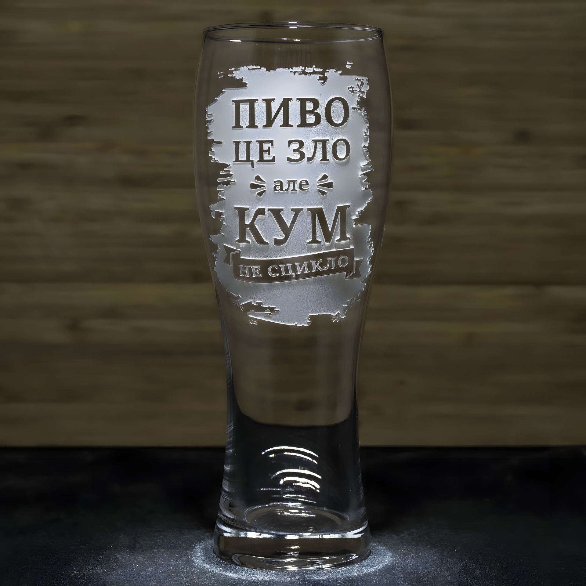 - Стильная гравировка: Надпись "Пиво это зло, но кум не сцикло" выгравирована в стильной матовой рамке, которая придает бокалу неповторимый шарм.