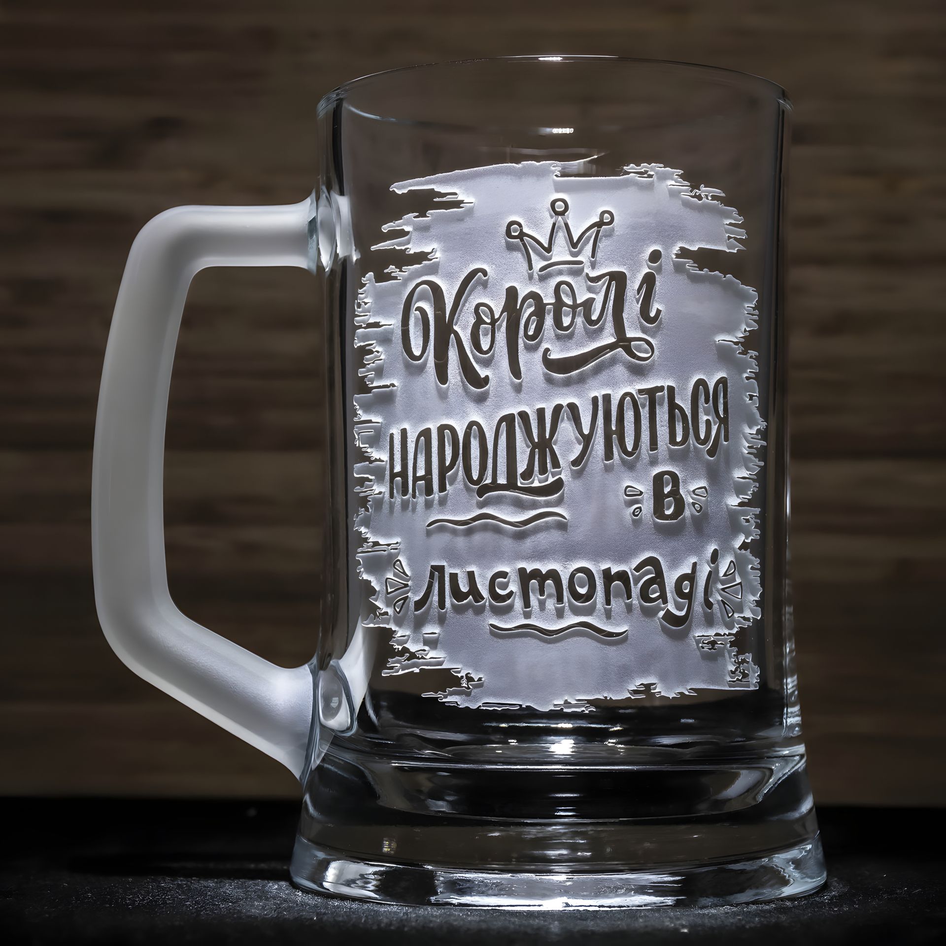 Стеклянная кружка для пива с ручной механической гравировкой надписи Короли рождаются в ноябре, глянцевая с матовой ручкой в подарочной коробке