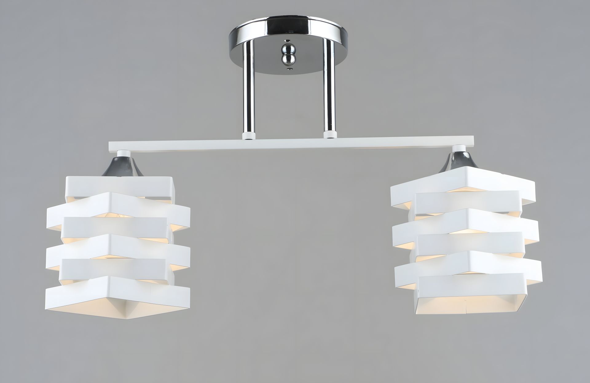Каркас изготовлен из высококачественного металла белого и хромового цвета, что придает люстру современный и стильный вид. Два металлических плафона белого цвета создают мягкий и равномерный свет, который сделает ваш интерьер еще уютнее.