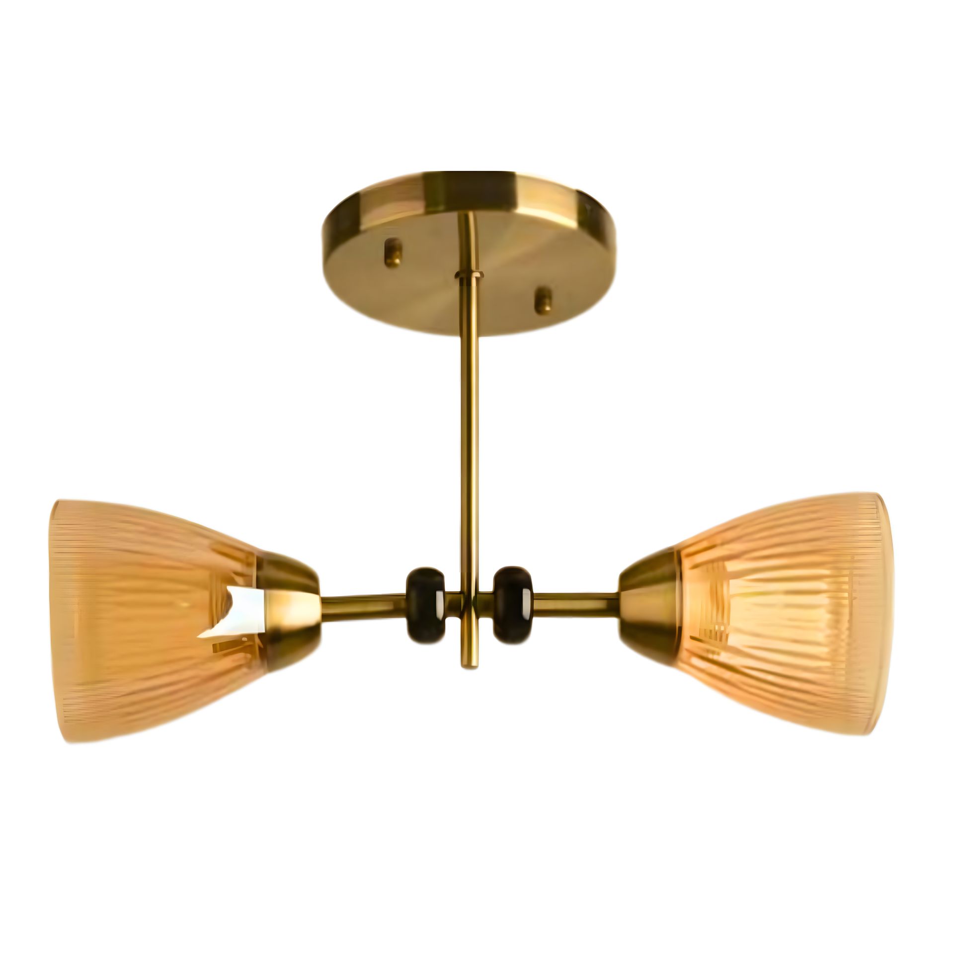 Плафоны лампы имеют конусную форму и сделаны из стекла золотистого оттенка. Каждый плафон направлен в разных направлениях, создавая интересный эффект освещения и игры света. Золотое стекло добавляет теплоты и шарма к внутреннему пространству.