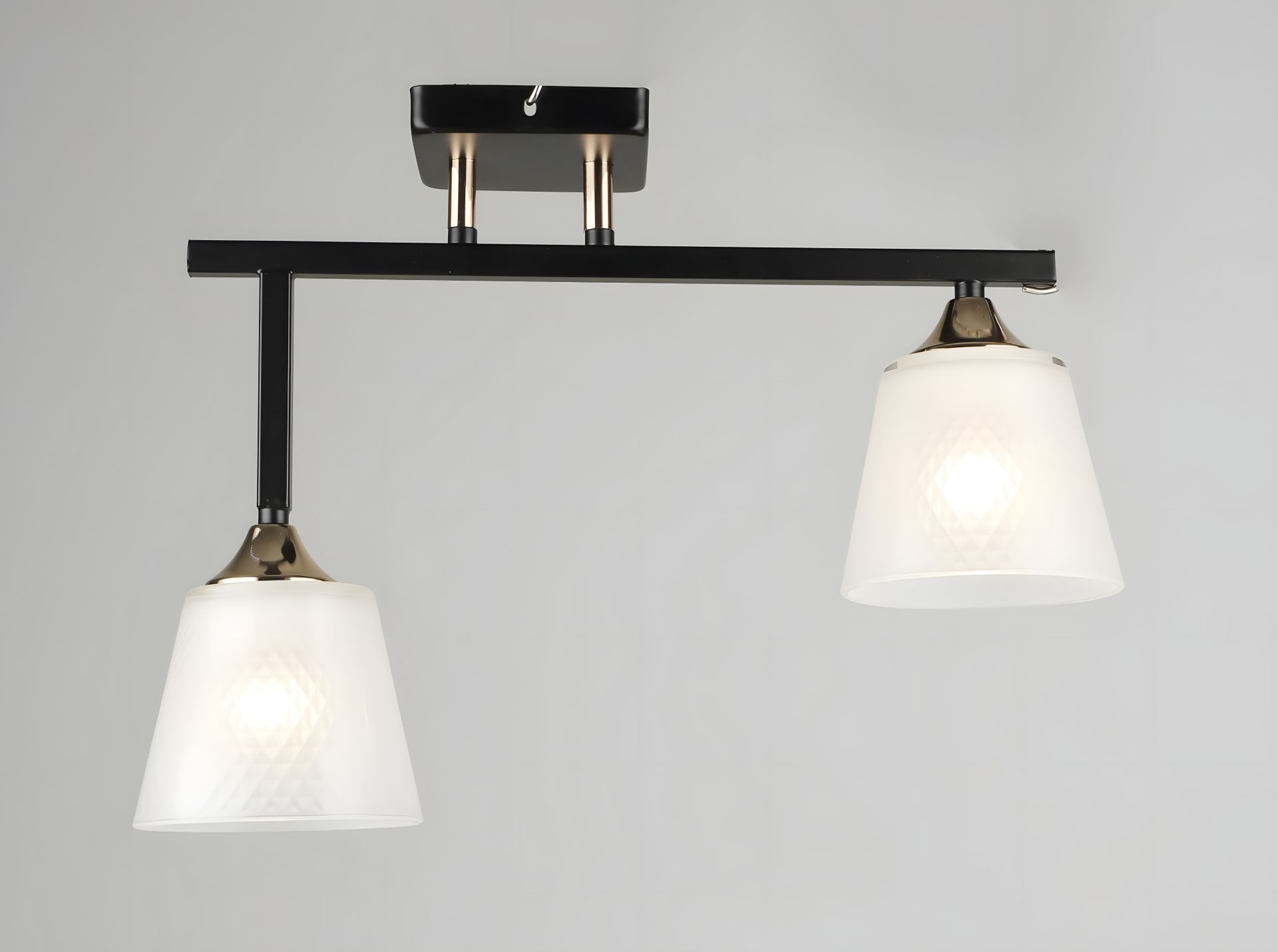 Люстра имеет два плафона из акрила, один из них расположен ниже, а другой выше. Это создает гармоничный геометрический баланс и игру света, что делает освещение более динамичным и интересным. Цвет прозрачно-белых плафонов придает свету и легкости.