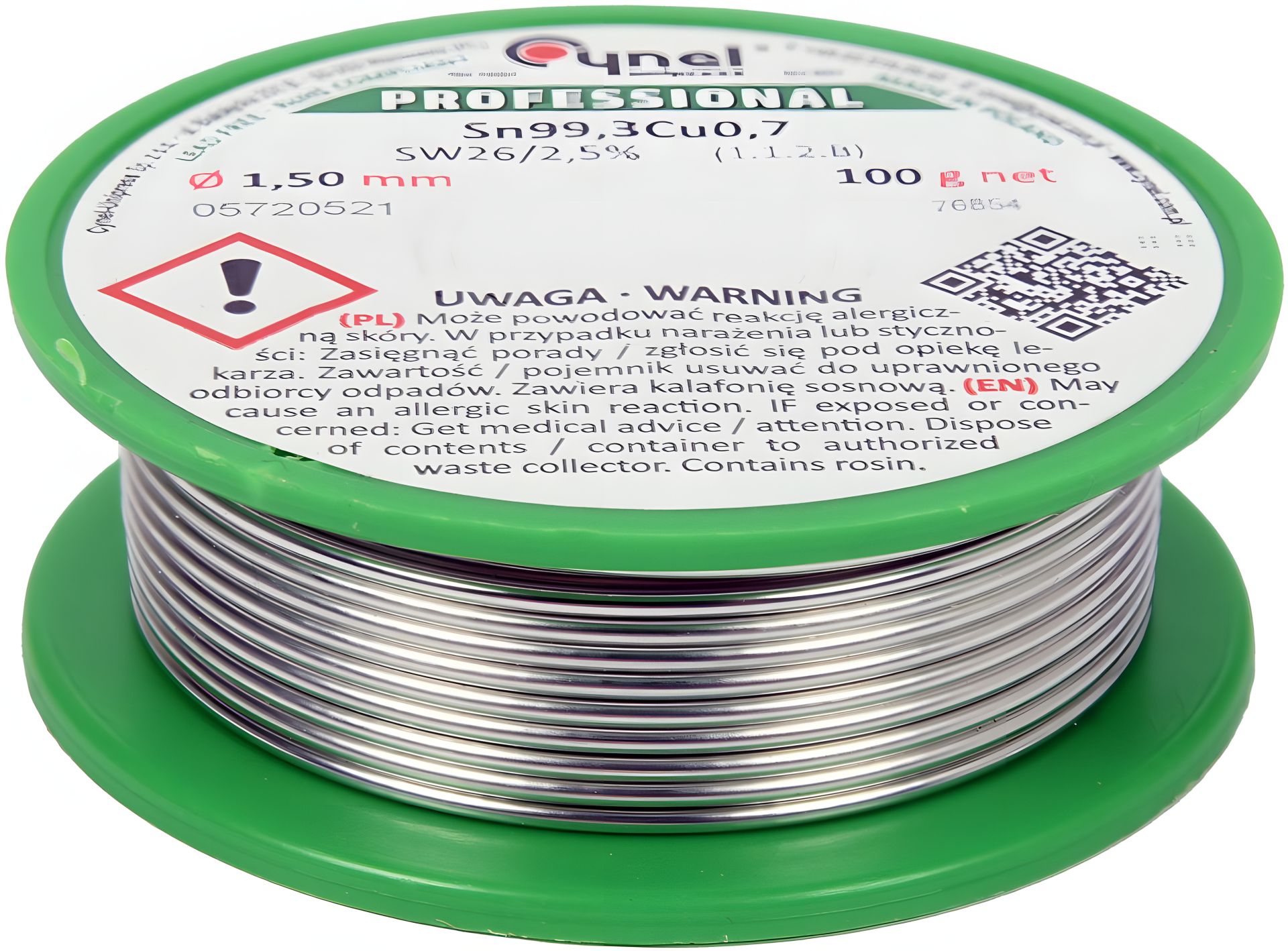 Припой без свинца CYNEL: Ø1,5 мм, Sn99,3-Cu0,7 проволочный на катушке с флюсом 100 г.