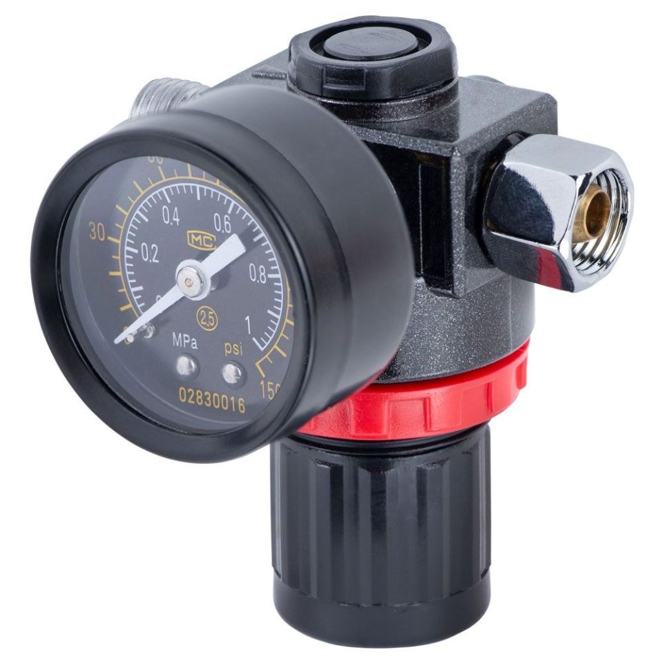 Также для нормальной работы пневмоинструмента необходимо определенная величина давления, редуктор позволяет ограничить высокое давление. Оснащен манометром, благодаря которому предоставляется возможность мониторинга уровня давления в системе.