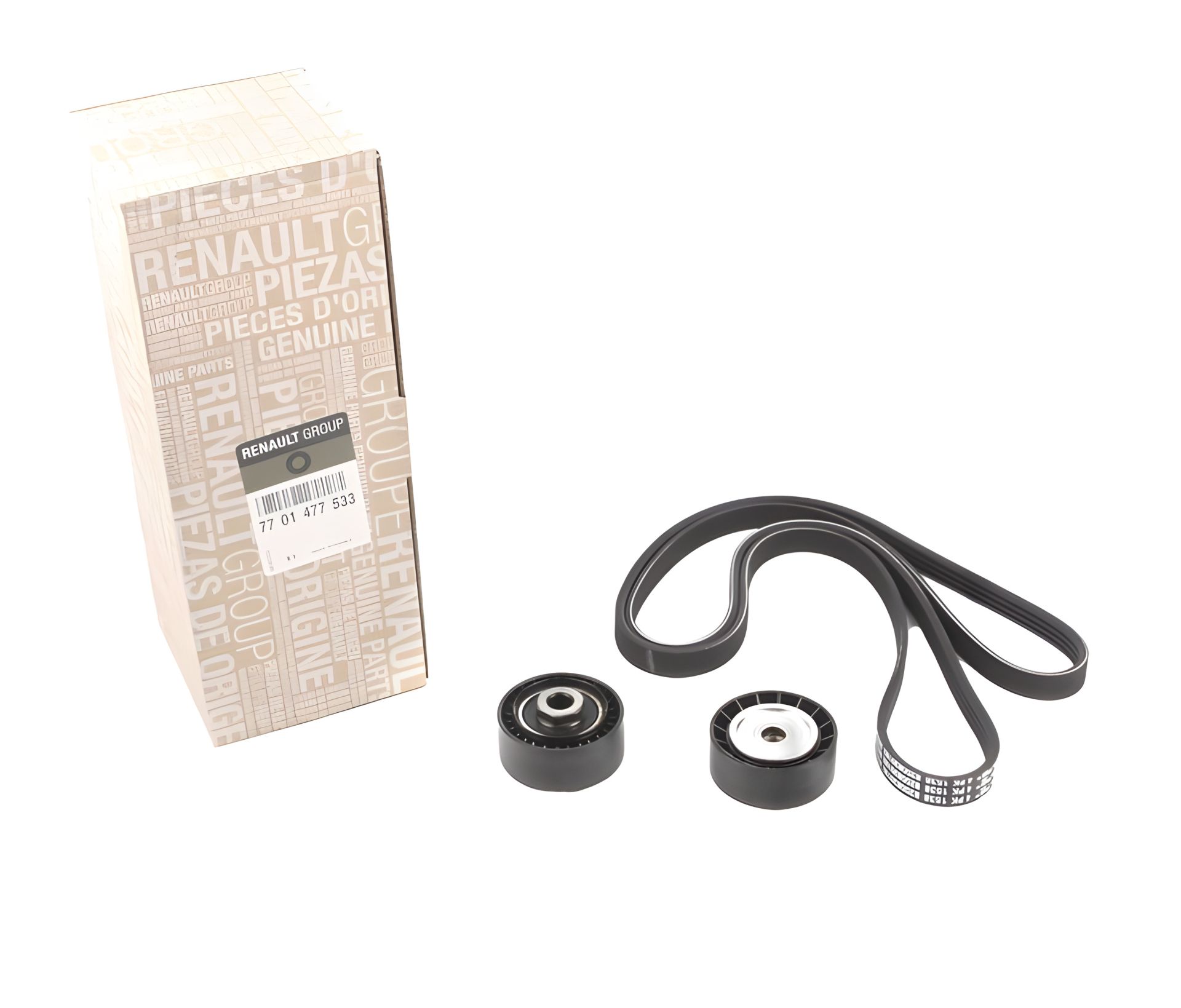 Техническая информация Наборы содержат оригинальные детали Renault, качество которых обеспечивает максимально длительный срок службы транспортного средства. Оригинальная деталь Renault полностью отвечает техническим особенностям каждого транспортного средства, а качество используемых для ее производства материалов гарантирует прочность и длительный срок службы. Перед каждой заменой следует ознакомиться с инструкцией по техническому обслуживанию автомобиля. Комплектация Ремень - 4PK1538 (8200830192) Ролик натяжной - 8200875156 Ролик паразитный - 119239050R